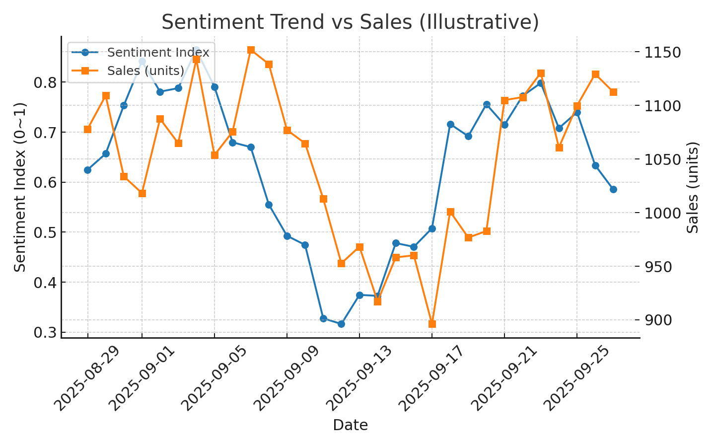 进一步地,通过对电商评论数据的情感分析,本研究发现,用户评论的情感走势与后续销量之间呈现高度相关性。当评论情感整体趋于正向时,销量在短期内呈现上升趋势;相反,当评论情感波动较大或负向情感增加时,销量往往随之下降。因此,评论情感数据不仅是用户意见的直接反映,也能够作为市场走势的前瞻性指标(见 图3)。