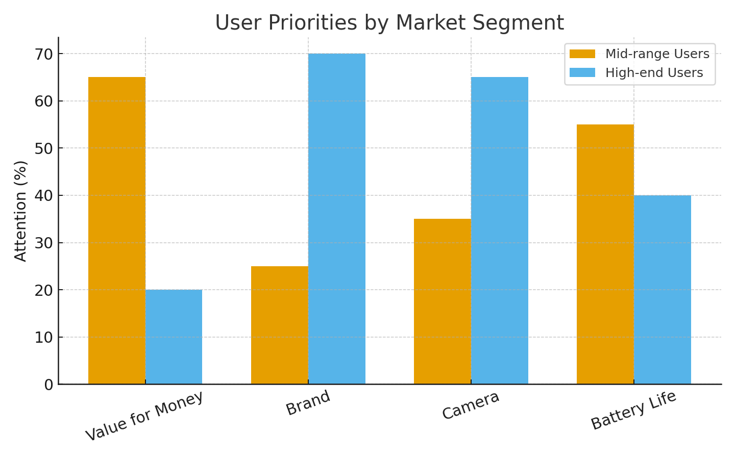 在真实数据测试中,系统揭示了不同价位段用户在需求偏好上的显著差异。具体而言,中端机市场的用户对性价比表现出高度敏感性,其购买决策主要集中在性能与价格的平衡点;而高端机市场的用户则更关注品牌价值与拍照体验。这一结果为厂商在产品定位与市场细分策略的制定中提供了明确参考(见 图2)。