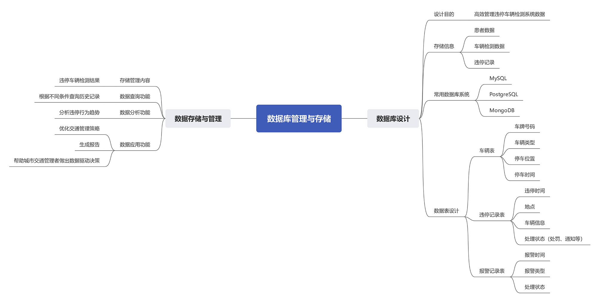 为了高效管理违停车辆检测系统中的数据,数据库需要设计存储患者数据、车辆检测数据、违停记录等信息。常用的数据库系统包括MySQL、PostgreSQL和MongoDB。