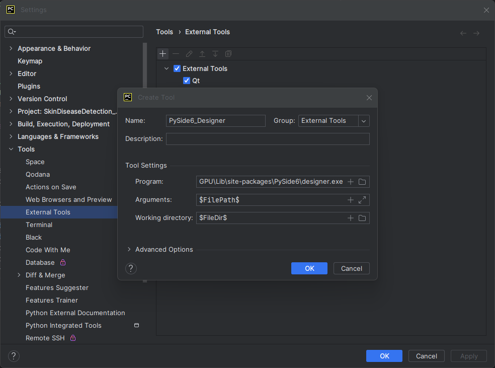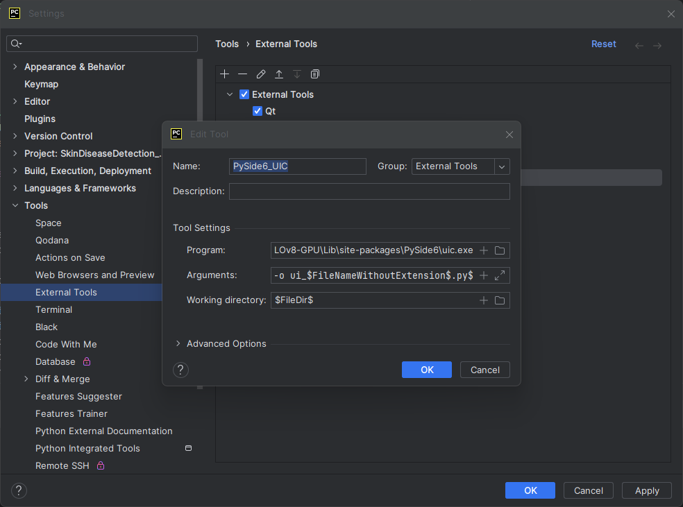如果你设计了一个 .ui 文件,需要通过PySide6的 UIC 工具将其转换为Python代码。为此,我们可以配置一个外部工具来实现自动转换。