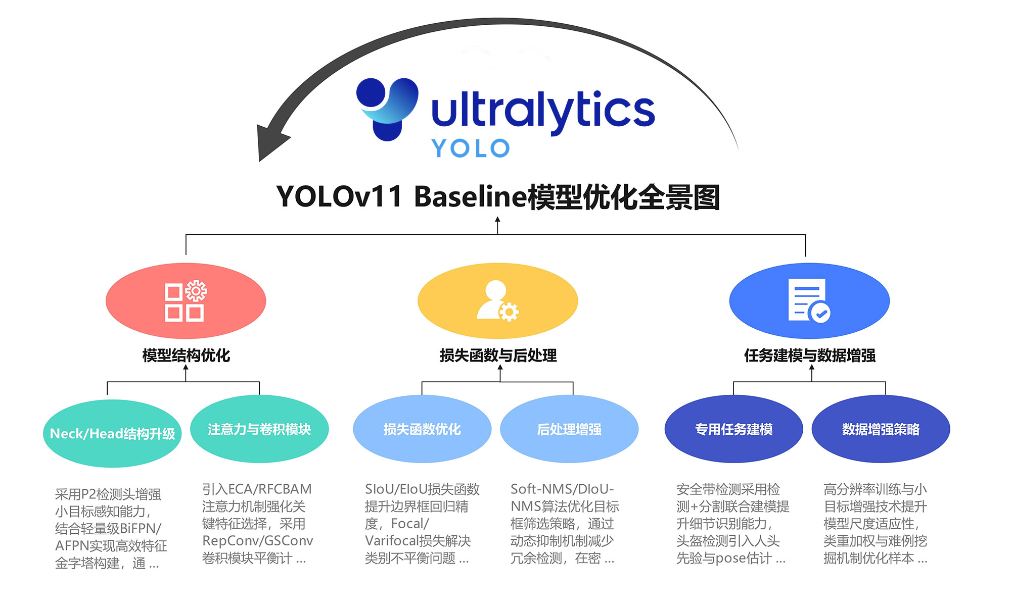 YOLOv11 是中心,所有优化手段都像是向外延伸的“分支路线”:
