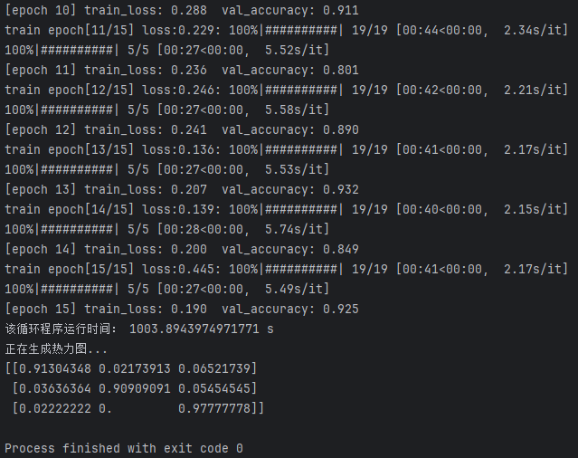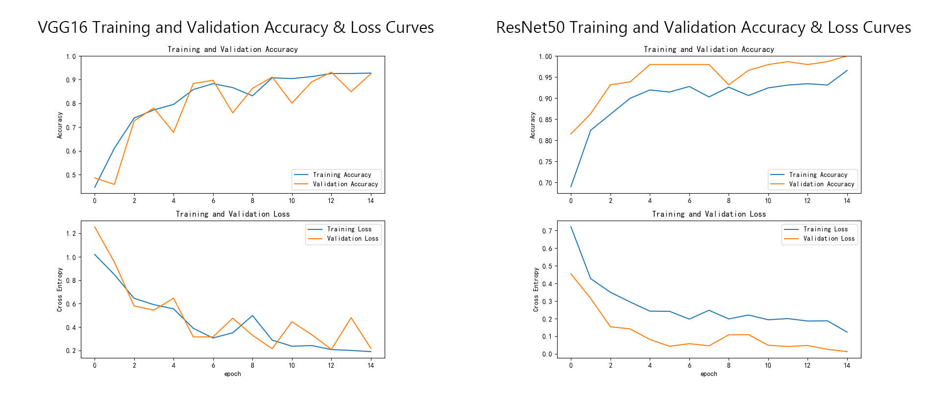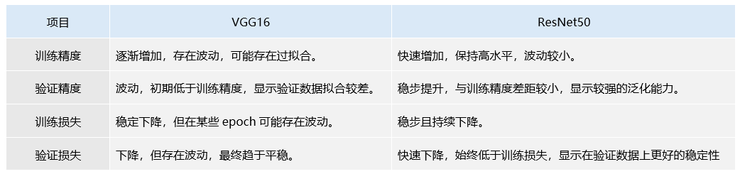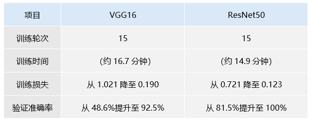 根据这个日志输出来看,VGG16在训练过程中表现出较为缓慢的进展,验证准确率在15个epoch后达到了92.5%,而ResNet50则以更快的收敛速度和稳定的训练损失,在最终epoch达到了完美的100%验证准确率,显示出更强的泛化能力。