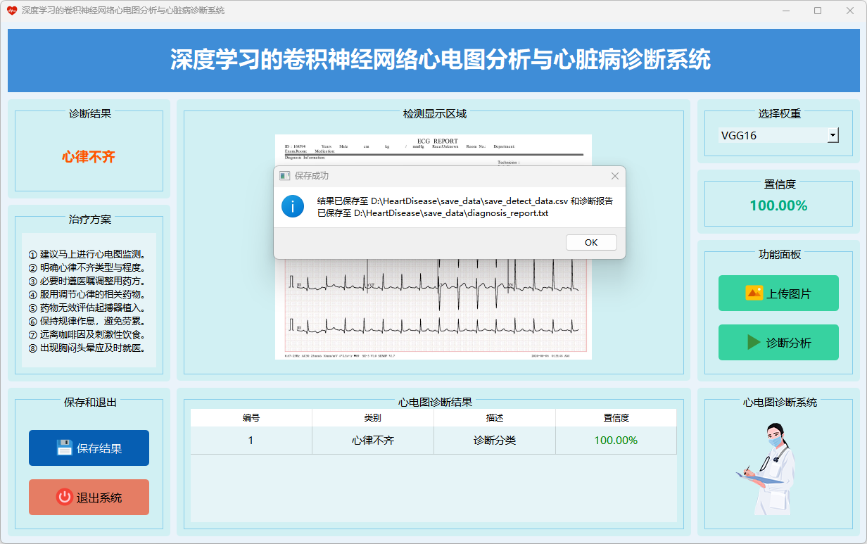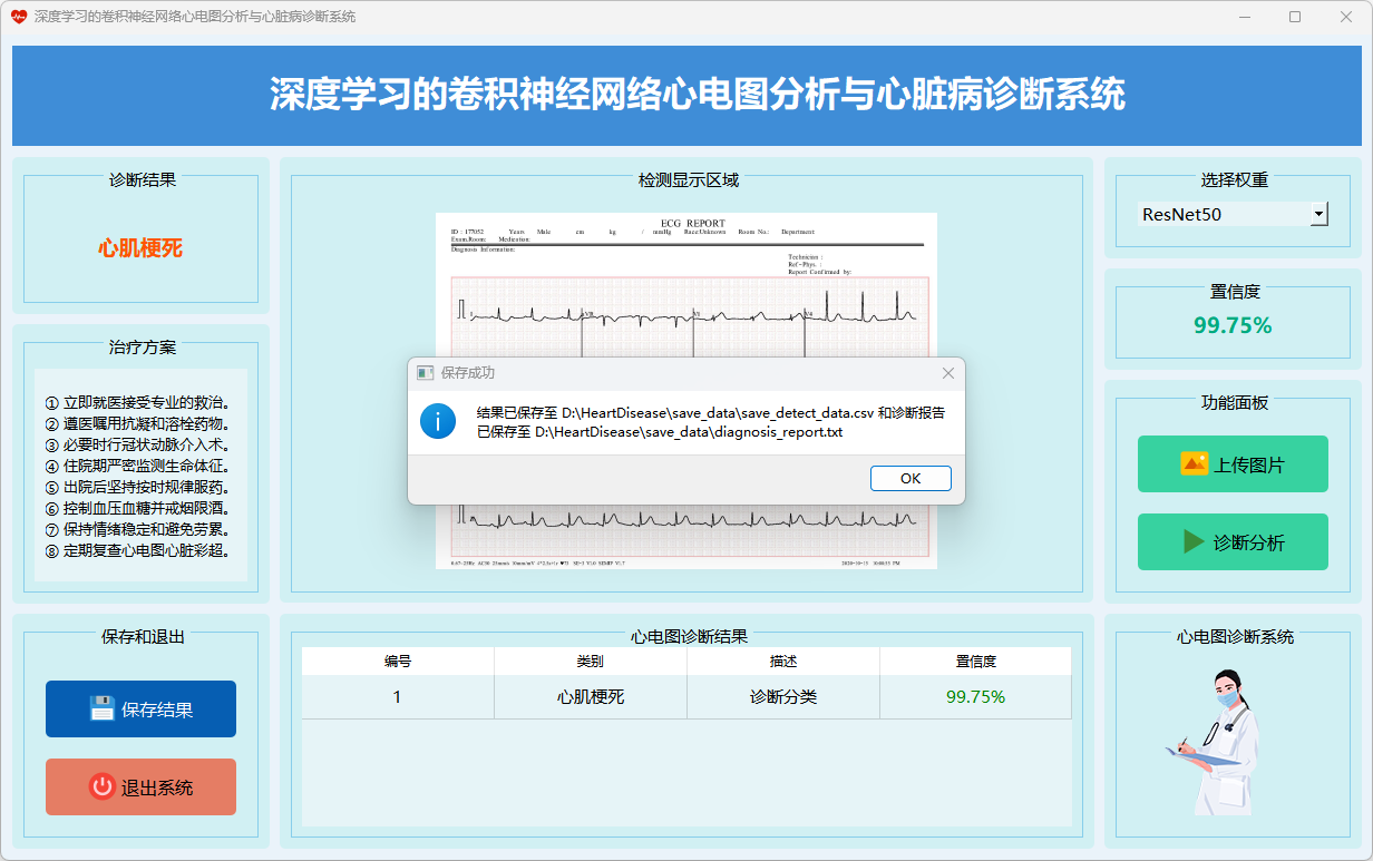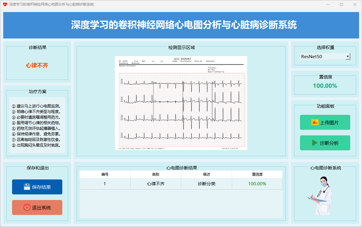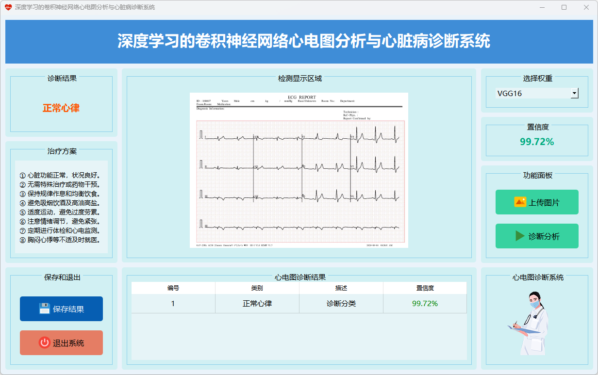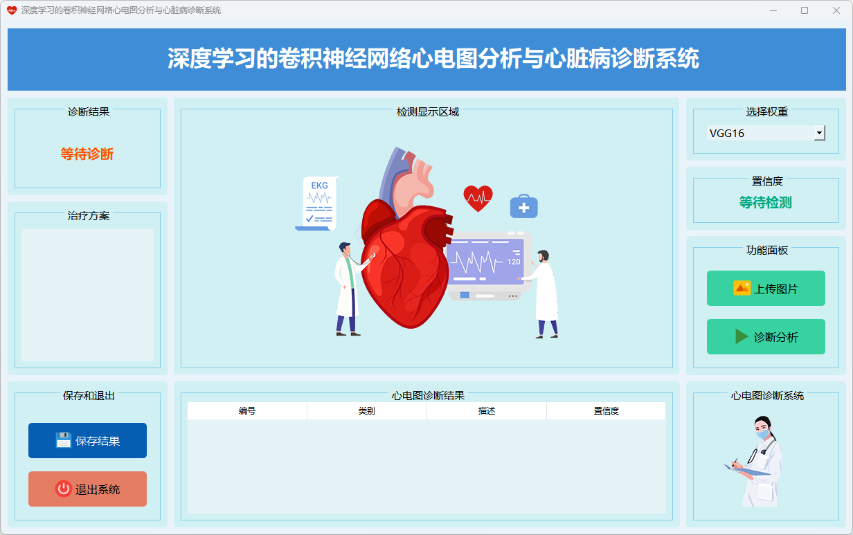 本系统基于深度学习的卷积神经网络(CNN)模型,旨在进行心电图分析与心脏病诊断,提供多种模型选择与诊断结果展示形式,能够满足医学研究与临床诊断的多样化需求。。以下为主要功能界面的展示: