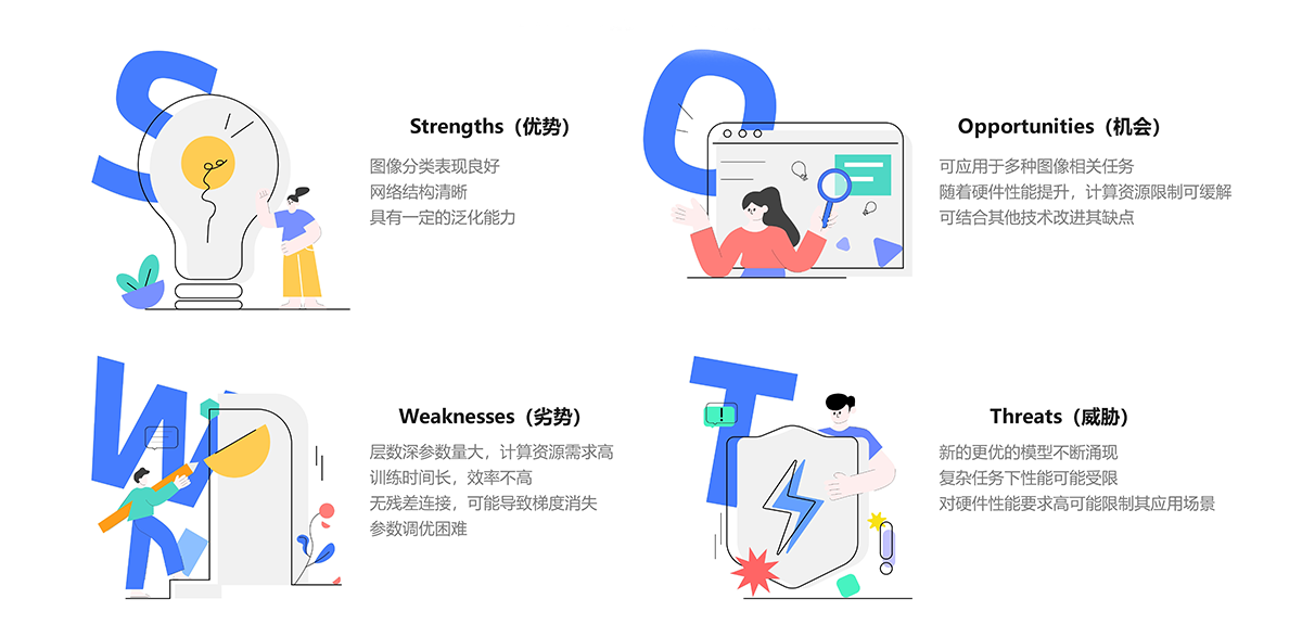 这张图展示了VGG16模型的SWOT分析,分别从优势、劣势、机会和威胁四个方面对其进行总结。通过对模型的深度结构、计算资源需求、可扩展性以及市场需求等因素的分析,帮助了解VGG16在实际应用中的潜力与局限。