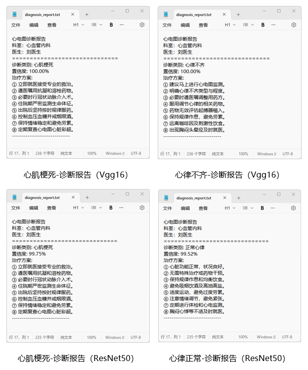 VGG16与ResNet50在心电图信号分类任务中的高效性和准确性,使其在心脏病诊断中具有重要的应用价值。通过对心电图信号进行实时分析,系统能够对心肌梗死、心律不齐和正常心律等心脏疾病进行有效分类。这为临床诊断提供了有力支持,尤其是在远程医疗和实时监控中,能够快速筛查患者的心脏健康状况。此外,VGG16与ResNet50模型的训练和推理效率使其在实际应用中具有较高的实时性,适用于心电监测、健康评估及辅助诊断等多个应用场景。