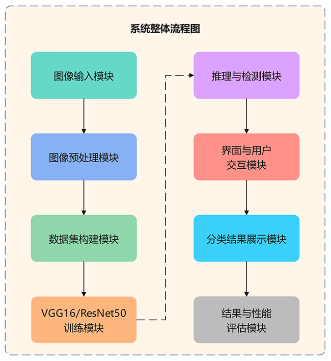 本系统旨在实现心电图(ECG)信号的自动分析与心脏病诊断,采用“数据输入 + 模型推理 + 结果展示”的一体化工作模式。系统架构包括图像输入模块、图像预处理模块、数据集准备模块、VGG16/ResNet50训练模块、推理与检测模块、界面与用户交互模块、检测结果展示模块以及实验结果与性能评估模块。前端界面通过图形用户界面(GUI)支持心电图数据的导入与交互操作,而后端则基于VGG16或ResNet50模型进行实时心电图分析与心脏病分类。VGG16与ResNet50模型在心电图信号分类任务中展现了较高的准确性和效率,能够有效区分心肌梗死(MI)、心律不齐(ARR)和正常心律(NL)等三类心脏疾病,因此具有广泛的应用前景,特别是在心脏病诊断与健康监测领域。