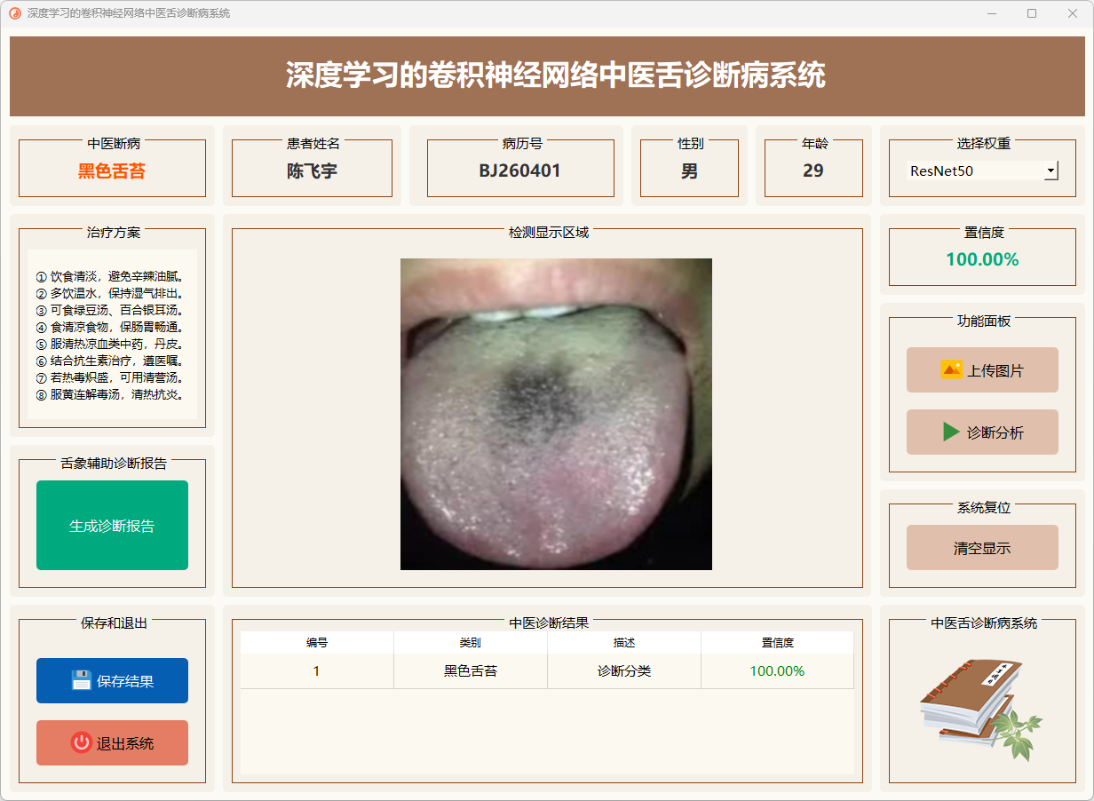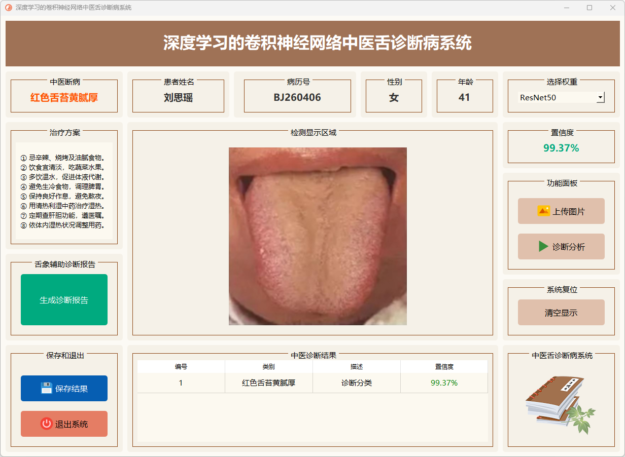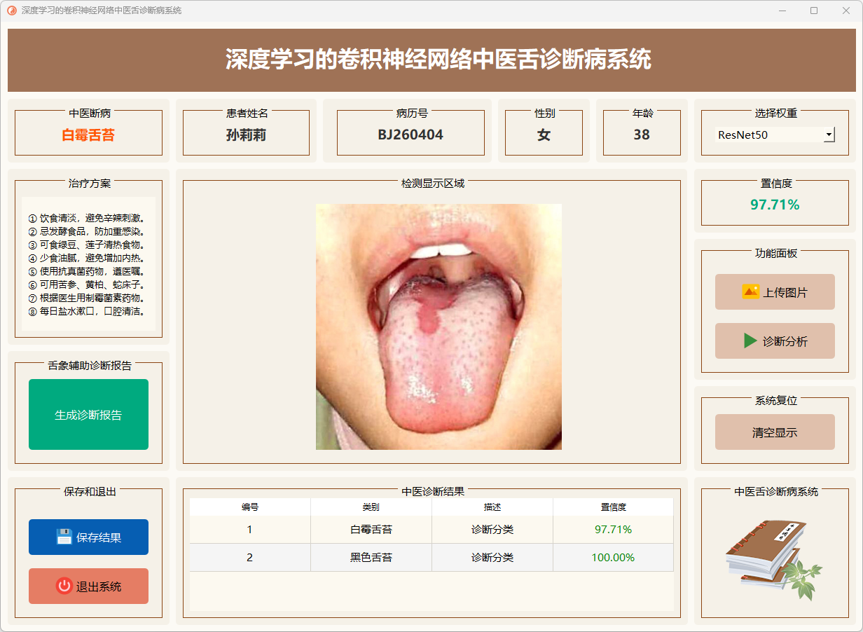 本系统基于深度学习的卷积神经网络(CNN)模型,旨在实现中医舌象图像的自动分析与疾病诊断。系统集成了多种深度学习模型(主要包括 ResNet50 与 VGG16),可对舌象图像进行特征提取、分类与诊断结果展示。通过对比不同模型的性能表现,本系统为中医舌诊的智能化、标准化研究提供了技术支撑。以下为主要功能界面的展示: