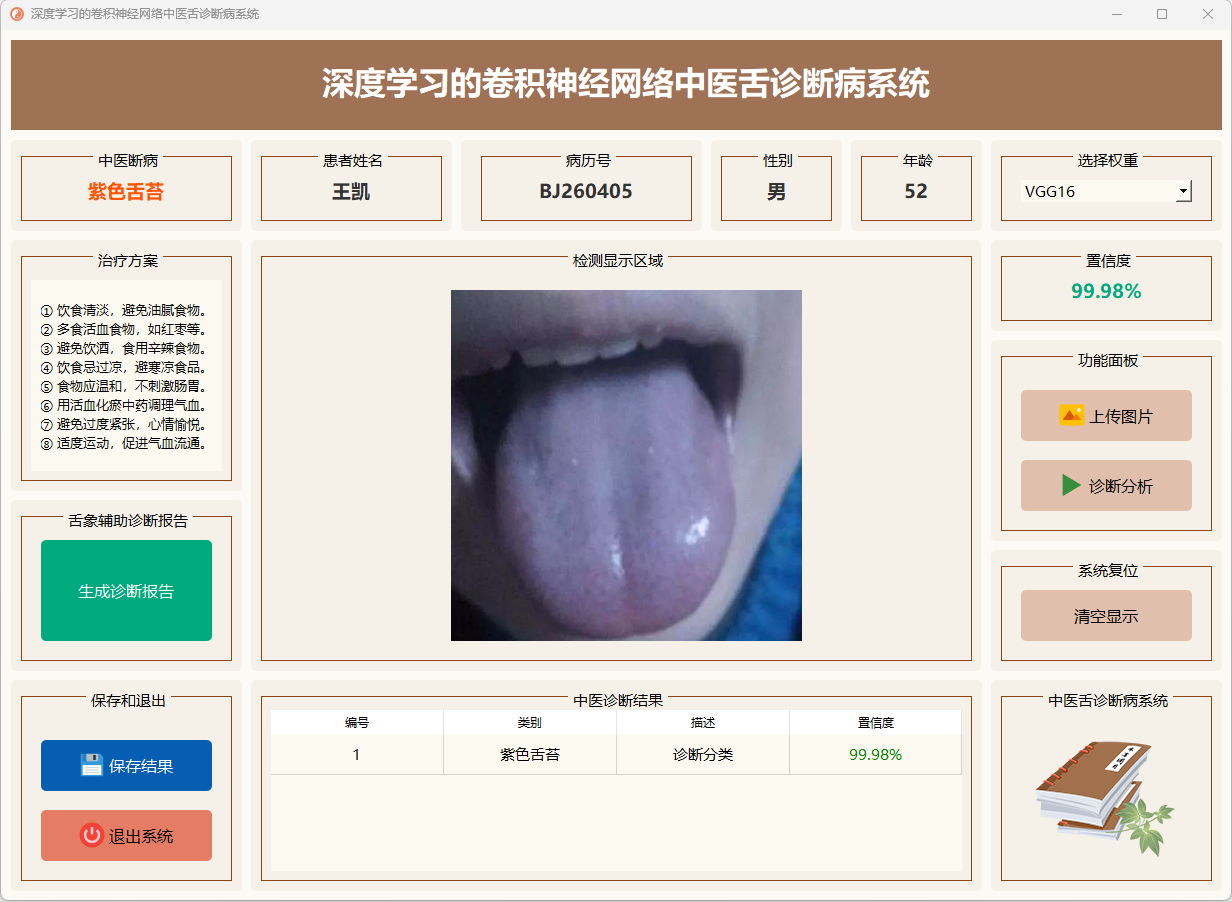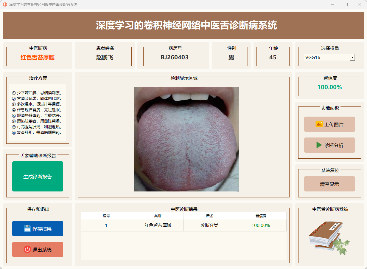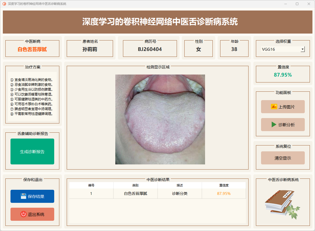 本系统基于深度学习的卷积神经网络(CNN)模型,旨在实现中医舌象图像的自动分析与疾病诊断。系统集成了多种深度学习模型(主要包括 ResNet50 与 VGG16),可对舌象图像进行特征提取、分类与诊断结果展示。通过对比不同模型的性能表现,本系统为中医舌诊的智能化、标准化研究提供了技术支撑。以下为主要功能界面的展示: