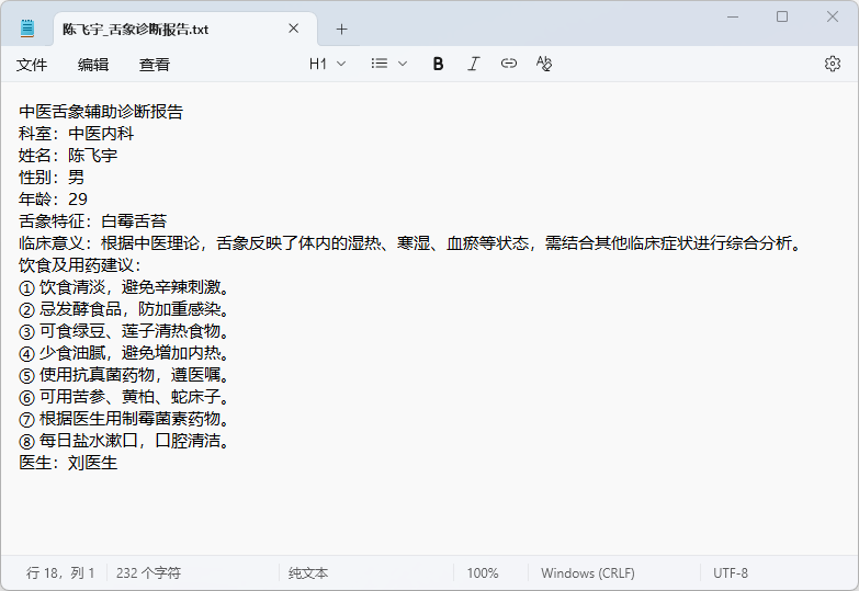 支持对舌苔图像进行快速检测。用户可以上传舌苔图像,系统会自动进行分析,识别舌苔病症类型,并给出诊断结果、治疗方案和置信度评分。检测结果通过清晰的文本和图表直观呈现,帮助医生快速做出诊断与治疗决策。