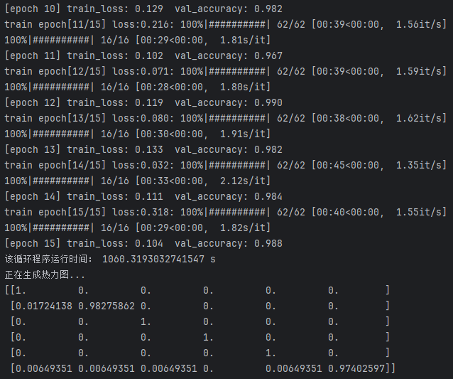 根据这个日志输出来看,VGG16 模型在训练过程中表现稳定,验证准确率最终达到 0.896,训练损失由 1.341 降至 0.283,在“红舌黄腻厚腻苔”和“紫舌苔”等类别上误分类较少;而 ResNet50 模型表现更为优异,验证准确率提升至 0.988,训练损失持续下降,几乎无误分类,整体分类精度和泛化能力显著优于 VGG16。