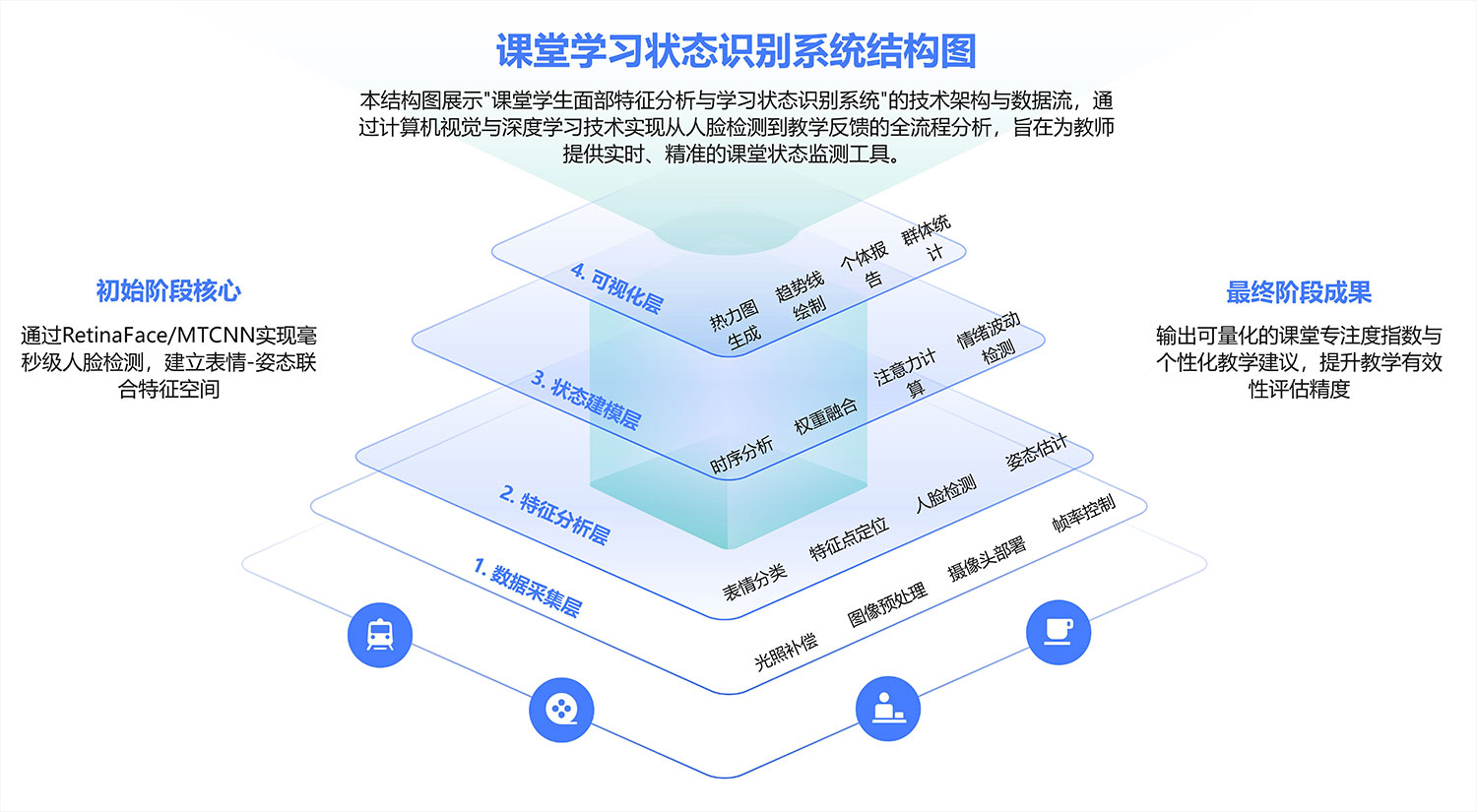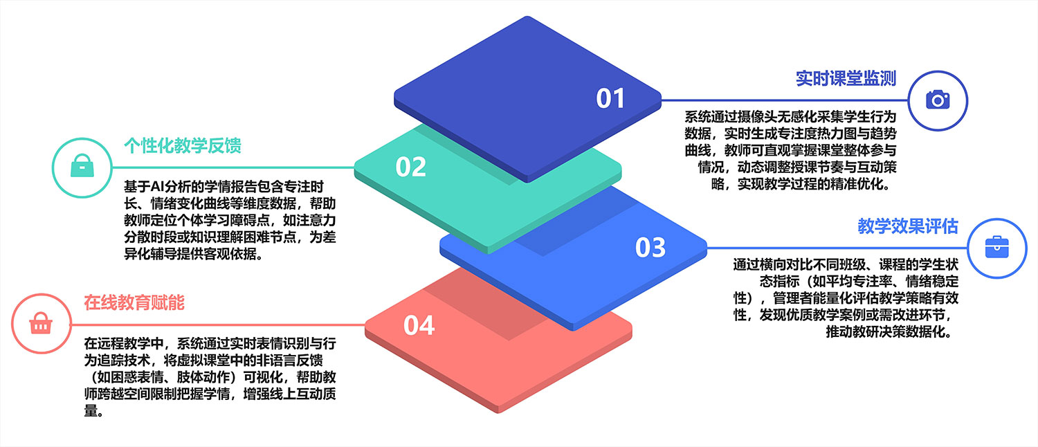 该系统在算法架构、模型训练与场景适配方面实现了创新突破,融合了深度学习、模式识别与教育心理学理论,形成教育领域人机协同的新范式。不仅显著提升了课堂互动与教学质量,也为教育管理与决策提供了科学依据,推动课堂迈向智能化、精准化与个性化的新阶段。