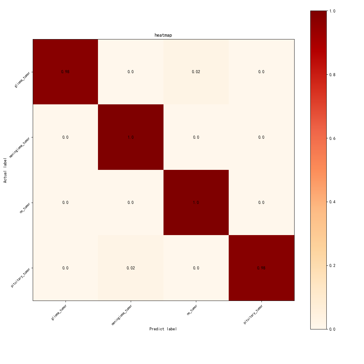 预测基本集中在对角线,整体分类清晰;少量误分主要为 glioma → no_tumor(约2%) 与 pituitary → meningioma(约2%),符合这两类在某些切片上影像表征相似、边界不清的临床特点;其余类别几乎无相互混淆,体现模型对关键特征的良好区分能力。
