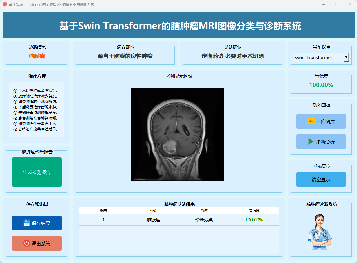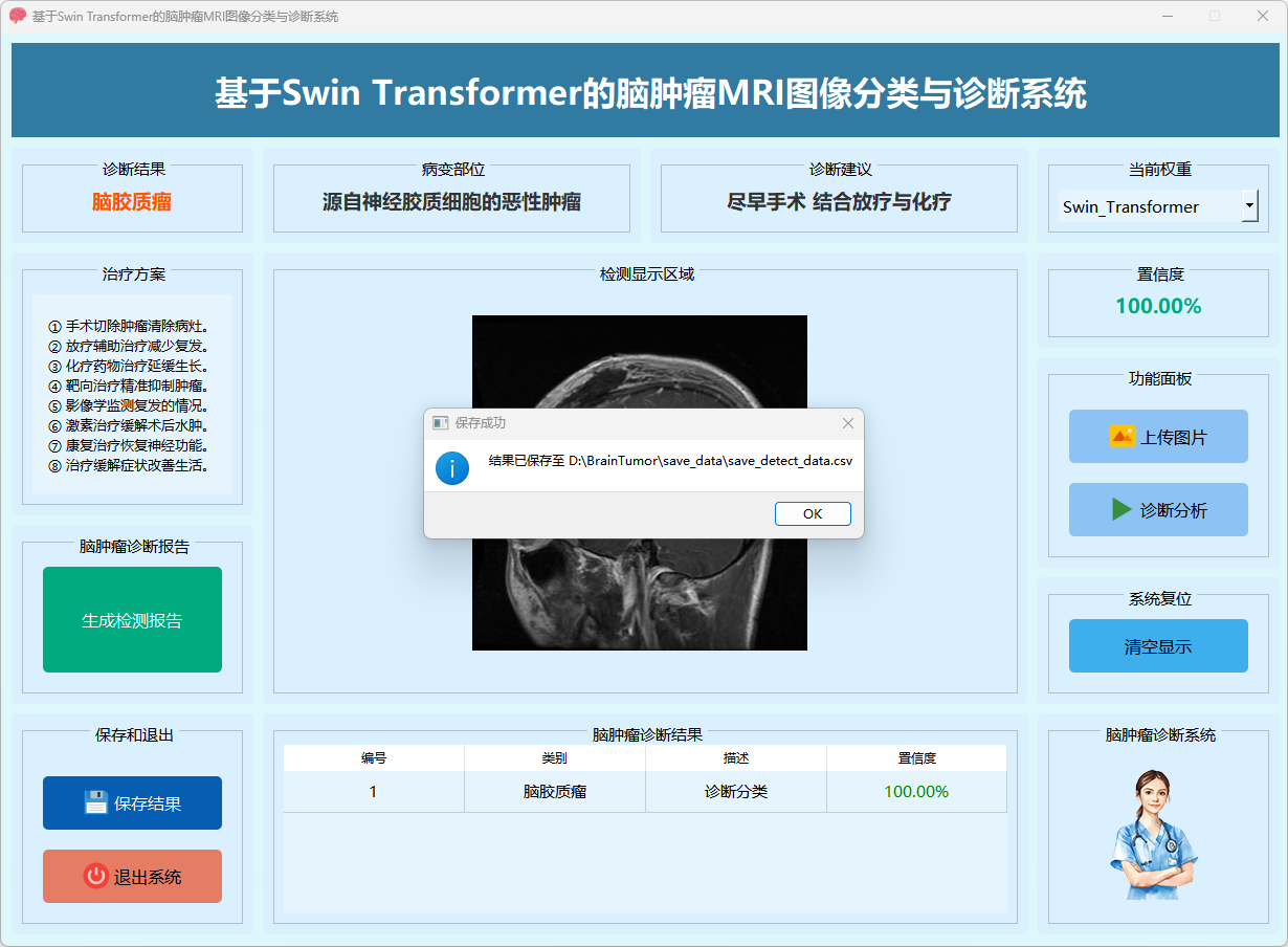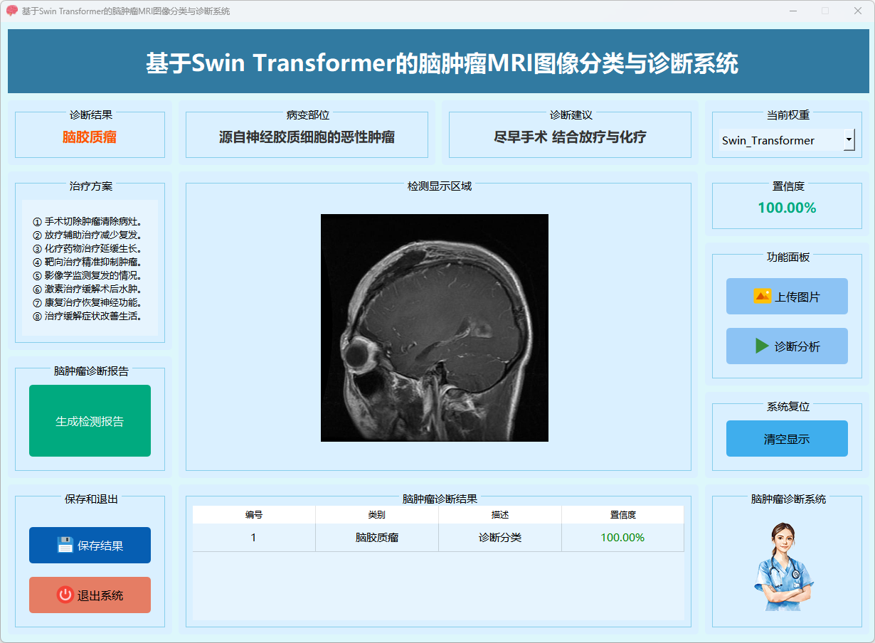 本系统基于深度学习的 Swin Transformer 模型,旨在实现脑肿瘤 MRI 影像的自动化分类与诊断。系统集成了Swin Transformer用于特征提取、分类推理与结果可视化展示,并可与其他对比模型进行性能评估,为脑肿瘤智能化、标准化诊断研究提供技术支撑。