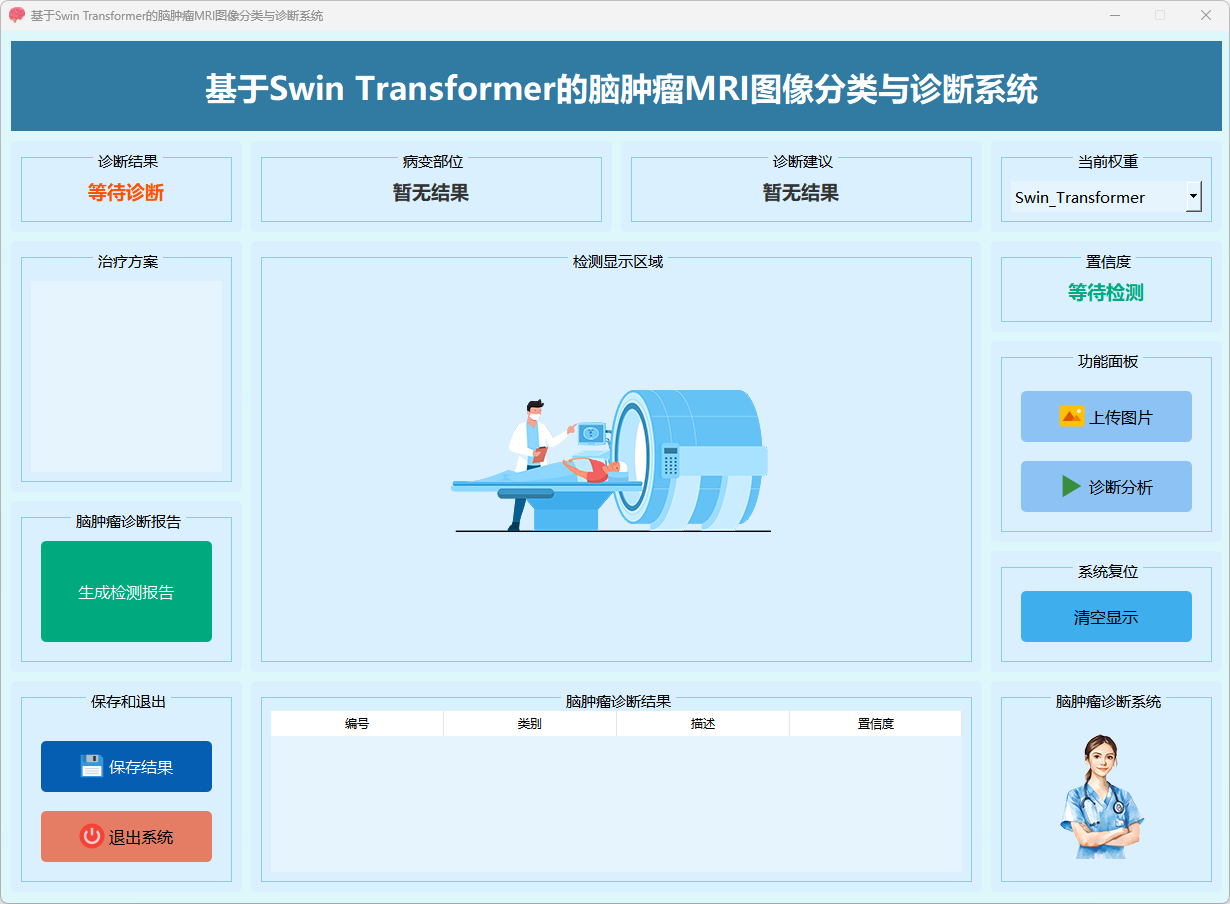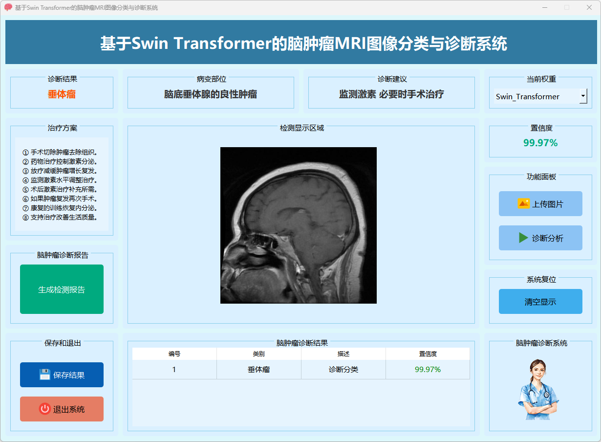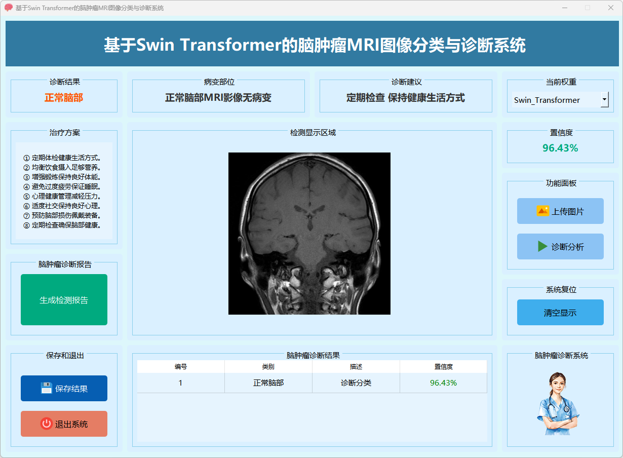 系统支持对脑肿瘤 MRI 影像进行快速诊断。用户上传脑部 MRI 样本后,系统自动完成分析,识别病变类型并给出诊断结果、分类标签与置信度评分,支持的类别包括脑胶质瘤、脑膜瘤、垂体瘤及正常脑组织。结果以清晰的文本与可视化图表直观呈现,便于科研人员与临床医生快速评估不同模型(如 Swin Transformer)在脑肿瘤诊断中的性能表现,从而为进一步的临床决策提供有力支持。