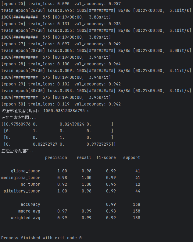 模型总体准确率约0.99,各类F1均在0.96–0.99之间,glioma、meningioma、pituitary 的Precision/Recall均接近满分;唯独 no_tumor 的Precision偏低(≈0.92),提示正常样本存在一定误报,但其Recall为1.00,说明对正常的漏检极少,整体表现稳健、均衡。