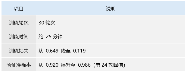 前10个epoch准确率快速上升后稳定在0.94–0.97区间,训练与验证曲线贴合,未见明显过拟合;训练损失持续下降,验证损失小幅波动,整体收敛良好。若要进一步稳固泛化,可增加正常样本多样性与难例增强,并尝试阈值校准以降低正常类误报。