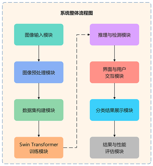 本系统旨在实现脑肿瘤MRI影像的自动化分析与智能诊断,采用“数据输入—模型推理—结果展示”的一体化工作流程。系统由图像输入、预处理、数据集准备、Swin Transformer训练、推理检测、用户交互界面、结果展示及性能评估等模块组成。前端通过图形用户界面(GUI)支持MRI影像的导入与操作,后端利用Swin Transformer模型对脑部影像进行特征提取与分类,精准区分脑胶质瘤、脑膜瘤、垂体瘤及正常脑组织等类型。该系统能有效辅助医生进行脑肿瘤诊断,提升影像分析的准确性与效率,为智能医疗诊断提供技术支撑。