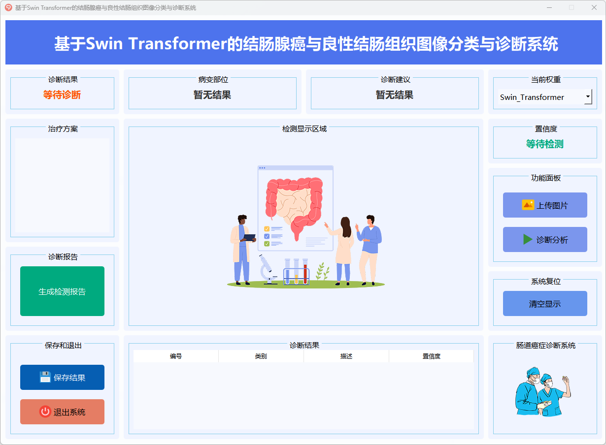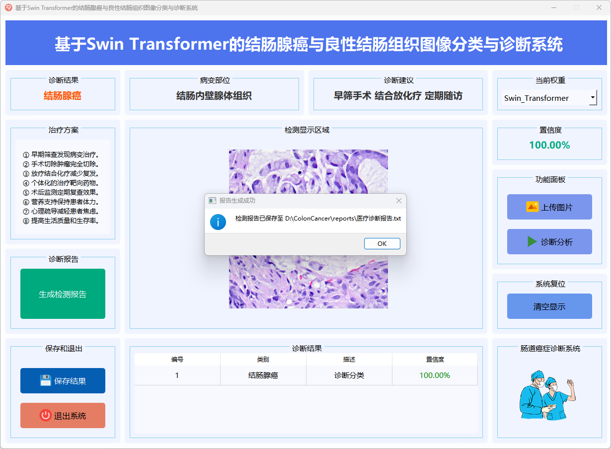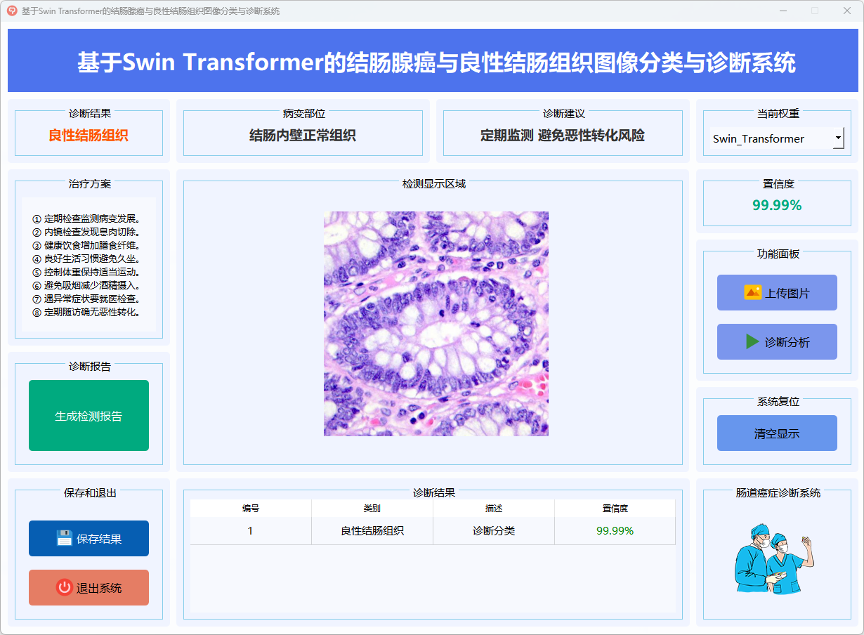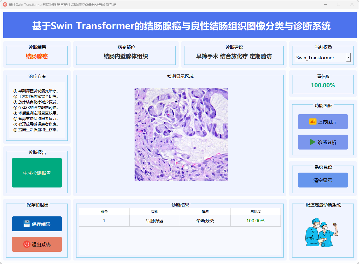 本系统基于Swin Transformer模型,实现结肠腺癌与良性结肠组织的自动分类与诊断,集成特征提取、分类推理与结果可视化,为结肠癌智能诊断和临床辅助提供支持。