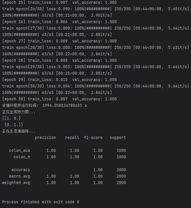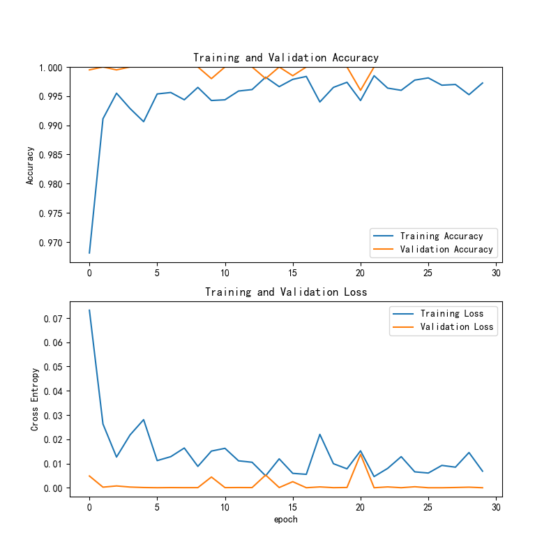 训练结果显示,模型在30个训练周期后,模型成功收敛,并且具备出色的分类性能,适合用于实际应用。