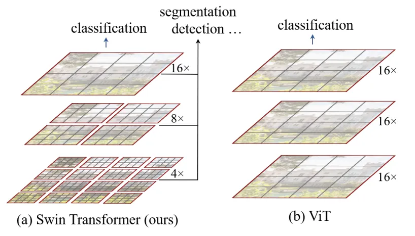Swin Transformer 的核心创新在于其分层结构和基于移位窗口的自我注意力机制。与标准视觉转换器(ViT)在整个图像中应用自我注意力不同,Swin Transformer将图像划分为不重叠的小窗口,在这些窗口内计算自我注意力,从而减少了计算复杂性。此外,Swin Transformer引入了窗口移位技术,使得在连续的Transformer块之间,图像区域能在不同层之间相互影响,从而更好地整合局部与全局上下文信息。