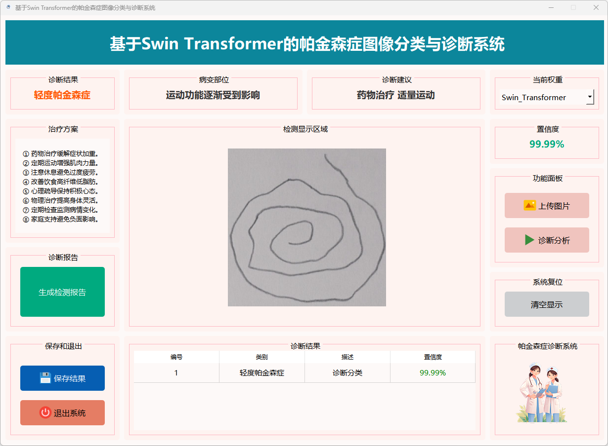 本系统基于Swin Transformer实现帕金森症不同阶段的手绘图案自动化诊断,涵盖健康、轻度、中度和重度四个阶段。通过“数据输入—模型推理—结果展示”流程,实现病变阶段精准识别,提升诊断效率。