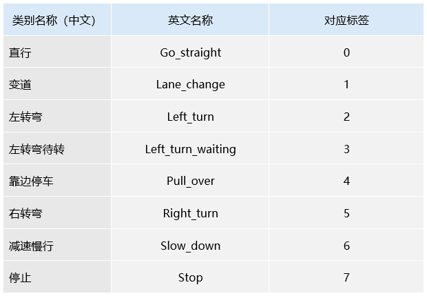 (2)数据结构:包含训练集与测试集,分为八类样本(直行、变道、左转弯、左转弯待转、靠边停车、右转弯、减速慢行、停止)。