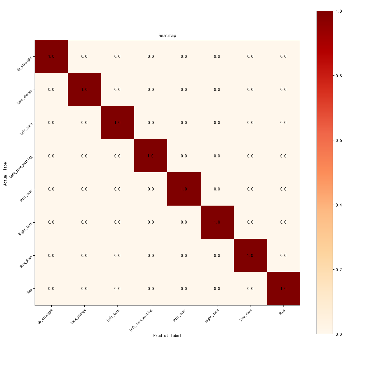 混淆矩阵显示所有类别的对角线值为1.00,表明每个手势指令(如直行、变道、左转弯等)都被准确分类。非对角线值为0,说明没有误分类,模型能够完美区分各手势指令。