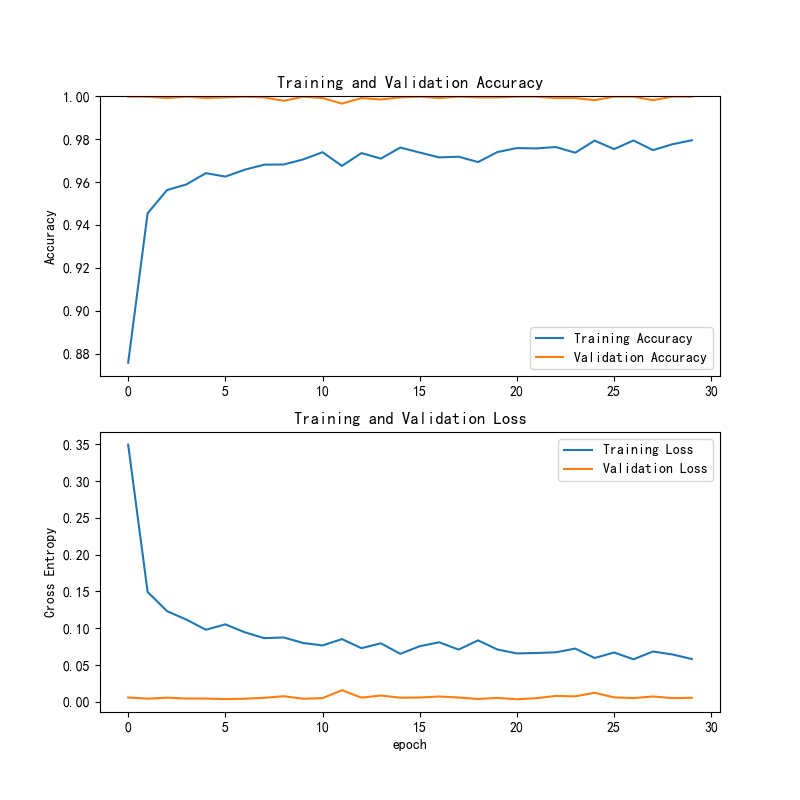 训练精度和验证精度逐渐稳定且保持较高水平,验证精度紧随其后,表明模型具备良好的泛化能力,未发生过拟合。训练损失快速下降并趋于平稳,验证损失维持在较低水平,显示出模型训练有效,且无明显误差或过拟合。