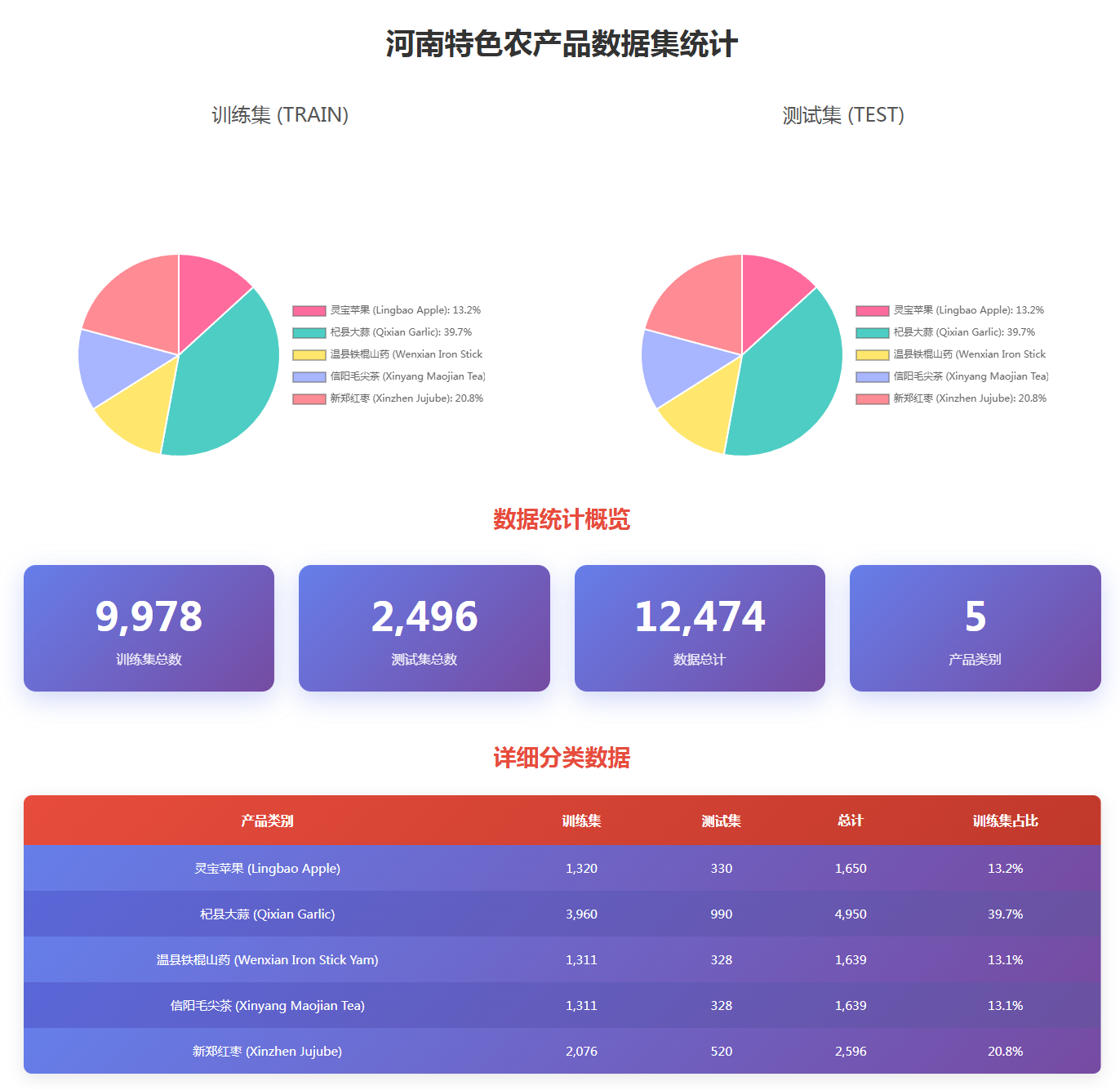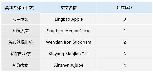 (2)数据结构:包含训练集与测试集,分为五类样本(灵宝苹果、杞县大蒜、温县铁棍山药、信阳毛尖茶、新郑大枣)。