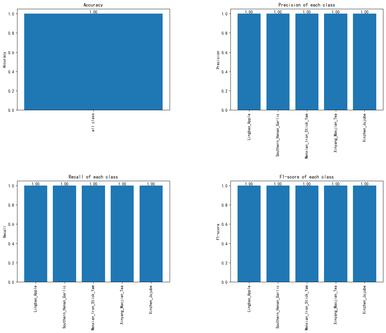 混淆矩阵显示每个类别的对角线值都为1(例如,“灵宝苹果”,“杞县大蒜”等),这表明模型能够完美地分类每个类别,没有任何误分类。