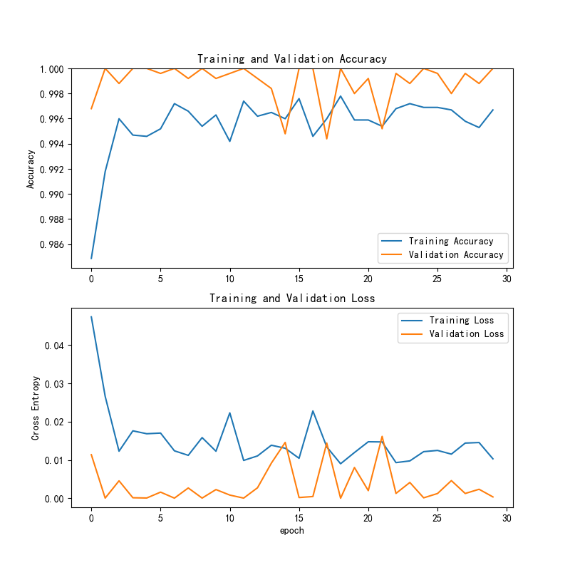 准确率图显示训练和验证准确率保持在高水平,接近1,表明模型表现良好。损失图中训练和验证损失较低,说明模型学习效果良好,没有明显的过拟合或欠拟合。