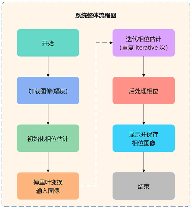 本系统旨在实现了基于幅度和初始相位的迭代法来恢复图像的相位信息,最终输出提取的相位图像并保存为指定文件。