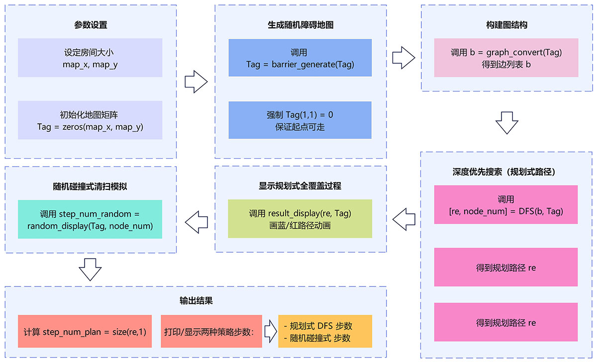 本研究围绕扫地机器人在室内环境中的全覆盖清扫问题展开研究,设计并实现了一个基于 MATLAB 的路径规划与仿真系统。针对室内环境中存在障碍物分布随机、空间结构复杂等特点,本文首先采用网格化建模方法对环境进行离散化表示,并通过分块随机生成与逻辑与运算相结合的方法构建可变障碍地图,以提高实验场景的多样性与真实性。在此基础上,构建了可行空间的邻接关系图,并采用深度优先搜索(Depth-First Search, DFS)算法实现规划式全覆盖路径搜索。该算法能够在保证遍历所有可达区域的前提下给出一条具有确定性的覆盖路径。