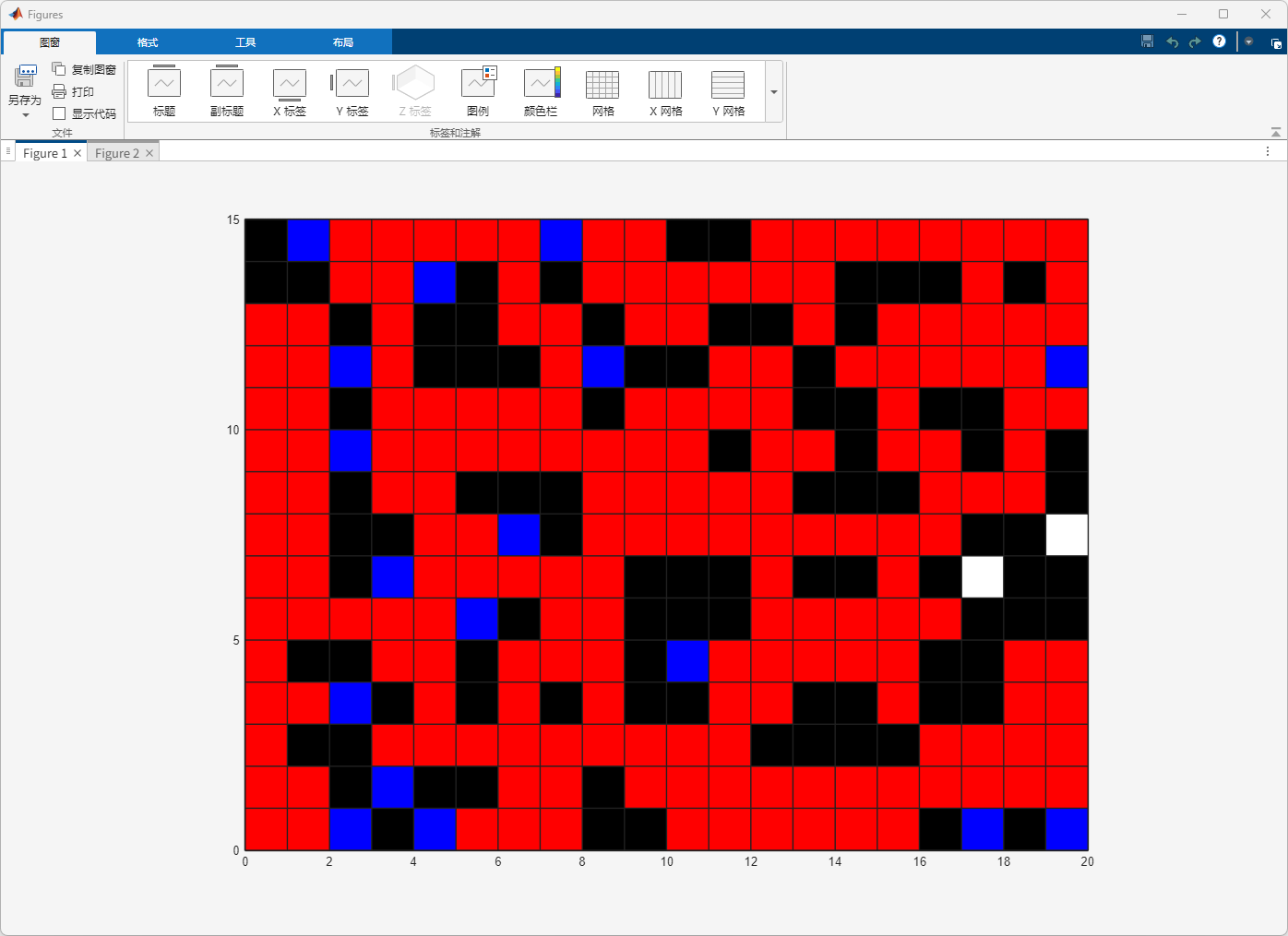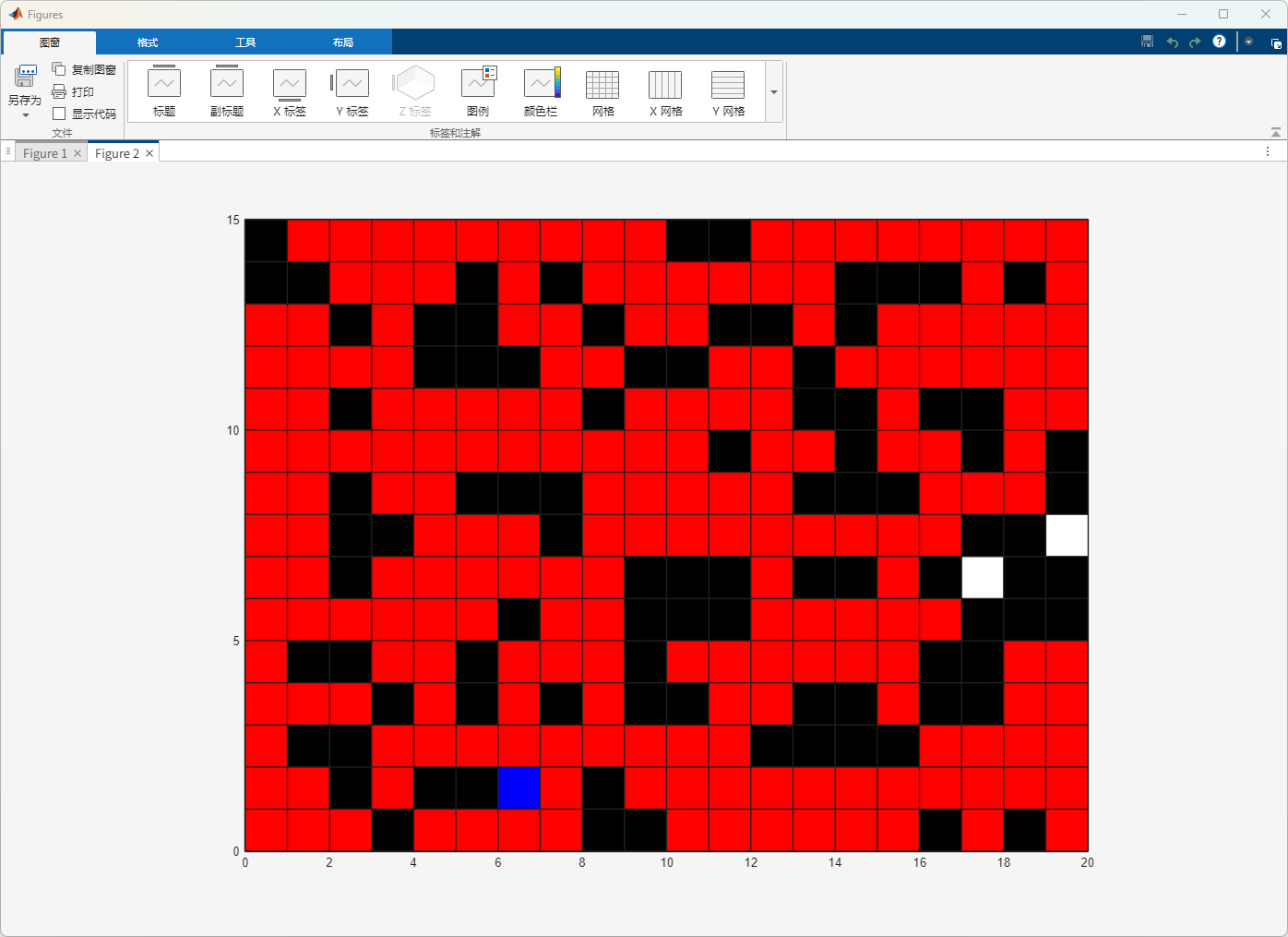 为对比规划式方法的优劣,进一步实现了随机碰撞式清扫策略,通过模拟传统扫地机器人依靠随机运动及简单避障行为完成全覆盖的过程,记录其行走轨迹及步数。在 MATLAB 环境中分别对两种策略进行了可视化展示,并对其清扫效率进行量化分析。实验结果表明,在具有随机障碍的 20×15 网格环境中,DFS 方法以较少的路径长度完成了全覆盖(408 步),而随机碰撞式策略的步数显著更高(9148 步),性能差距达 22 倍以上。