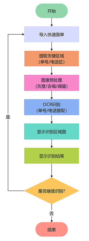 本系统基于顺丰快递面单的结构特点,从整体架构、功能模块划分与关键技术流程出发,构建了由图像预处理、关键信息提取、OCR识别和界面交互组成的面单智能识别系统设计方案。