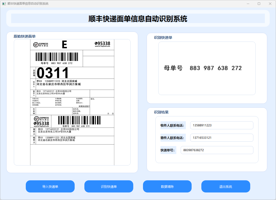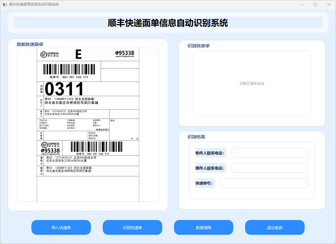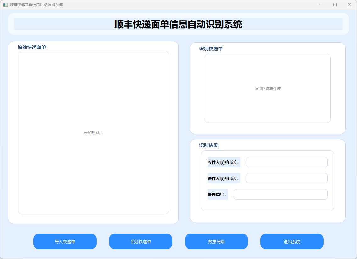 在系统实现方面,本文采用 Python 作为主要开发语言,以 PyQt5 为图形用户界面开发框架,完成了面单图像导入、关键区域可视化展示、识别结果输出与清除等功能模块的集成,实现了一套具有良好交互性与可视化效果的顺丰快递面单智能识别系统。实验结果表明,在多种拍摄条件与图像质量差异的情况下,系统对快递单号及联系方式等关键信息的识别准确率较高,处理过程稳定可靠,能够在一定程度上满足快递物流业务对面单信息自动化处理的实际需求。