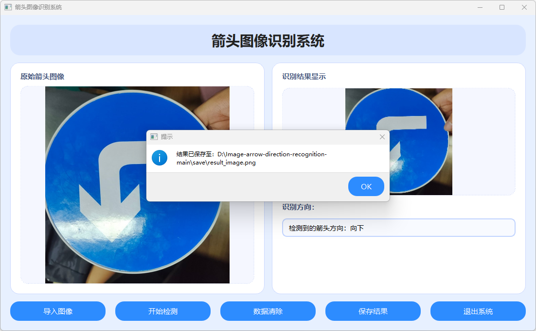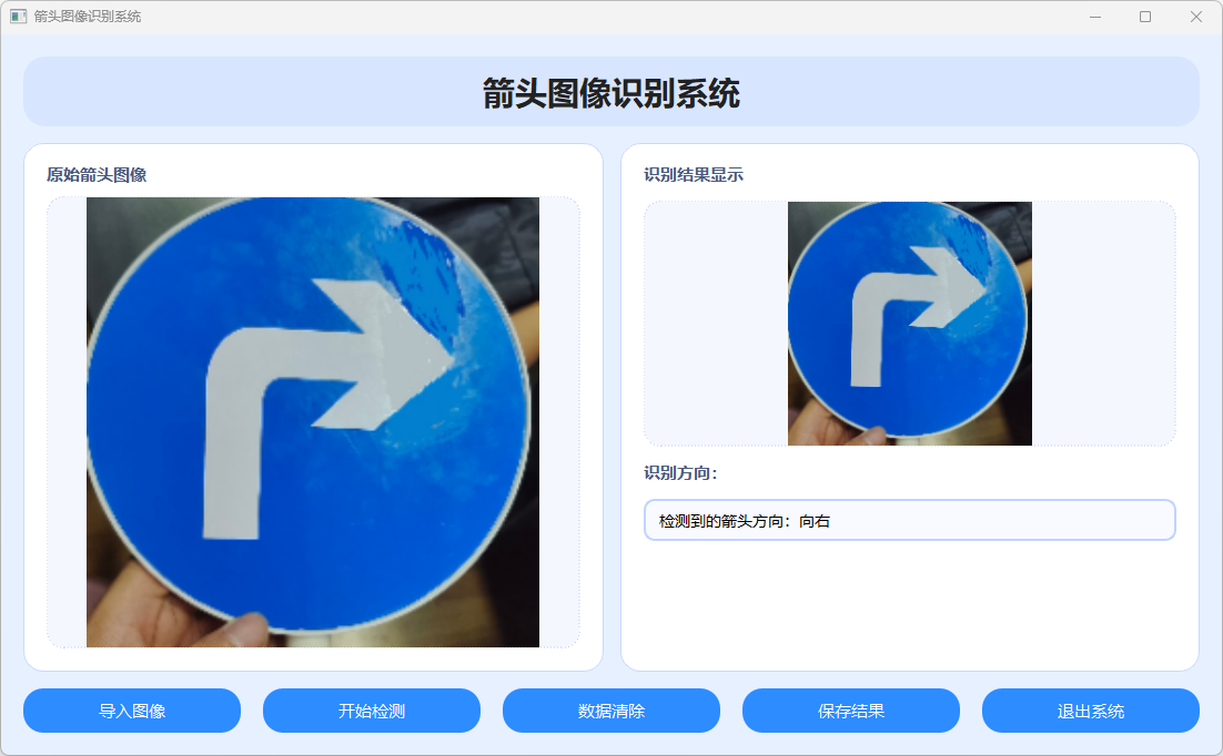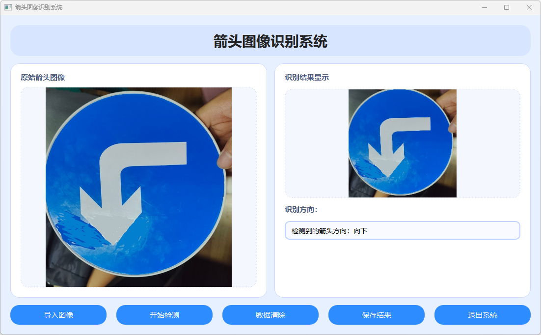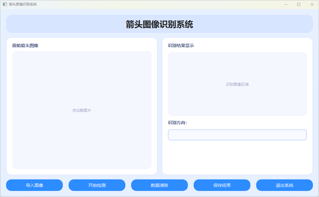 这是系统的主界面截图,用户可以在此界面进行箭头图像的导入、检测、清除以及保存操作。