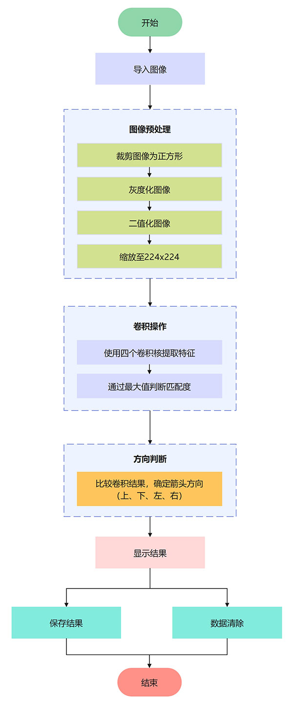首先,系统通过PyQt5实现了一个友好的用户界面,使用户能够方便地导入箭头图像,查看处理结果,并保存检测到的箭头方向。图像预处理模块包括缩放、灰度化、二值化等步骤,以便提取图像中的箭头特征。在核心的卷积操作中,系统设计了四种卷积核,分别对应箭头的四个方向(上、下、左、右)。通过卷积运算提取图像的局部特征并进行方向判定,从而识别出箭头的朝向。