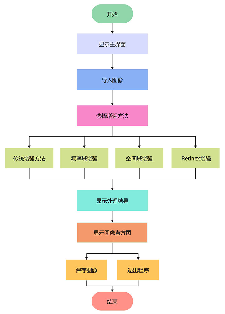 本系统的设计考虑了算法的实用性与计算效率,采用了多种增强方法的融合,以适应不同类型的图像增强需求。通过在多个图像数据集上的实验,验证了不同增强算法在各种场景中的应用效果。实验结果表明,Retinex算法与频率域处理技术的结合显著提高了图像的视觉质量,尤其在低光图像和高动态范围图像处理中的效果尤为突出。