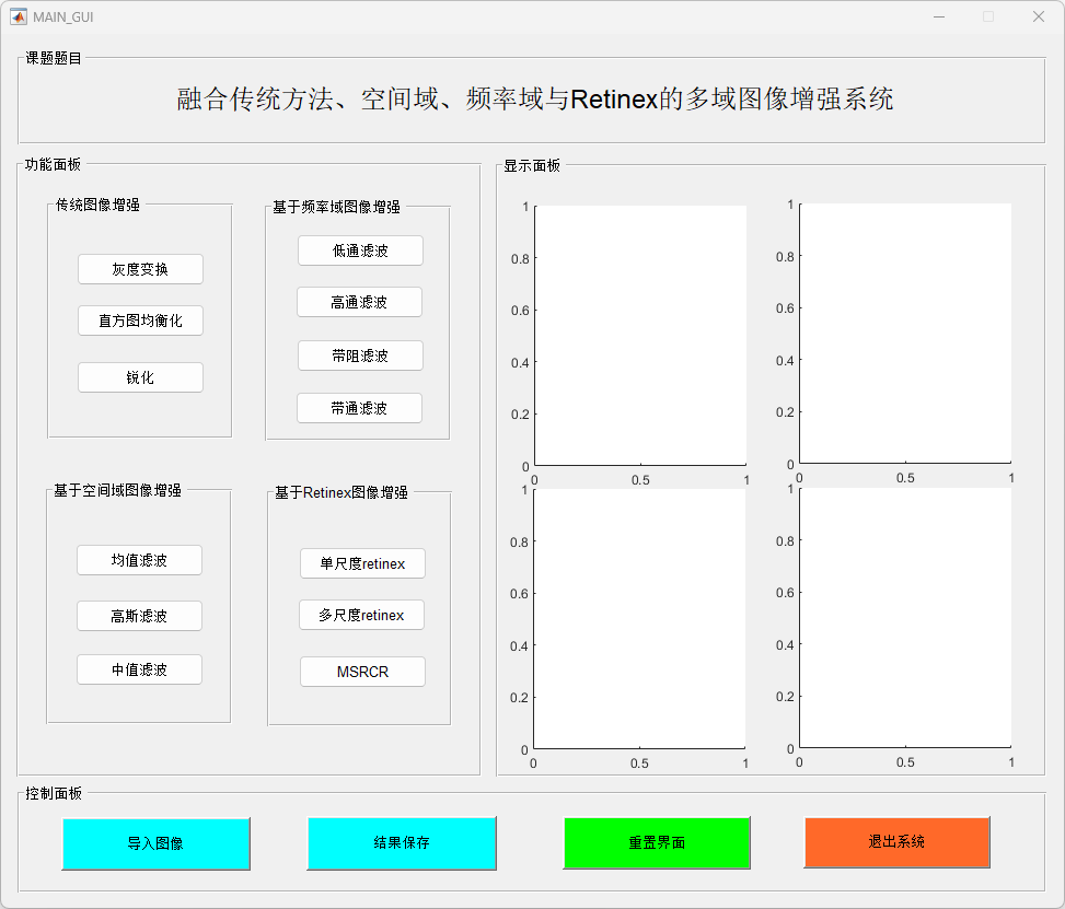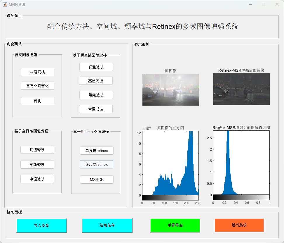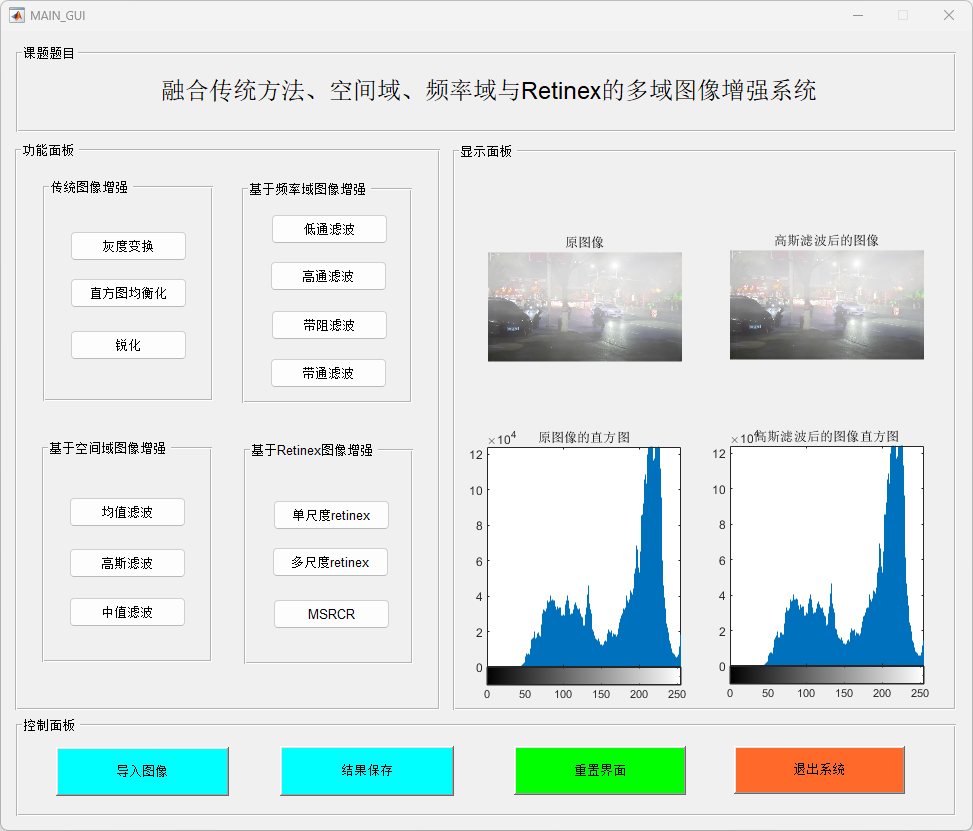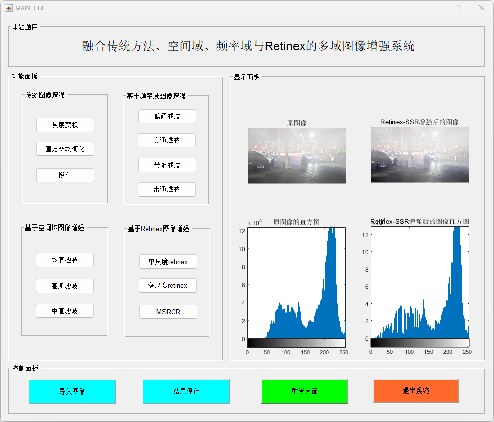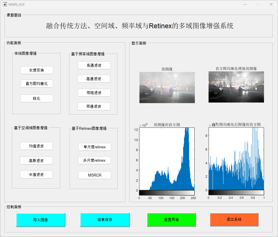 本研究提出并实现了一个基于MATLAB的多功能图像增强系统,结合了传统图像增强、空间域滤波、频率域处理和Retinex图像增强算法,以提高图像质量并增强图像细节。该系统通过一个用户友好的图形界面(GUI),提供了包括图像加载、增强处理、滤波操作及保存输出等多种功能。研究的主要贡献包括以下几个方面:
