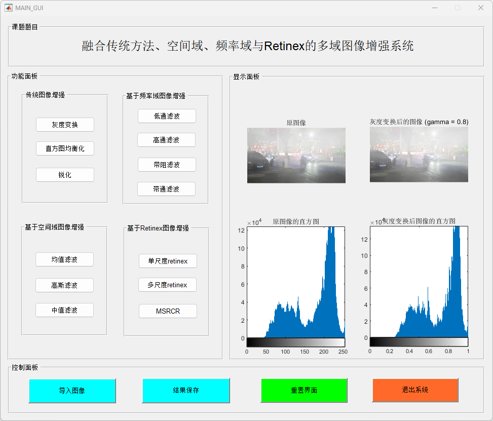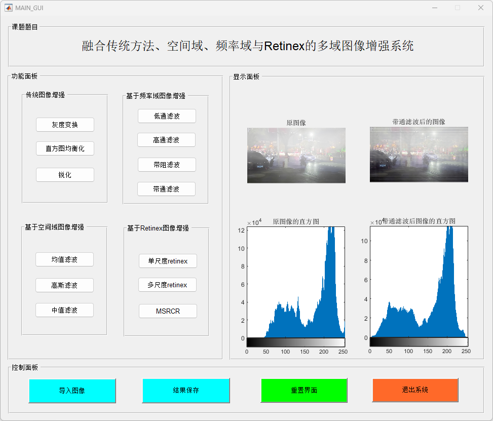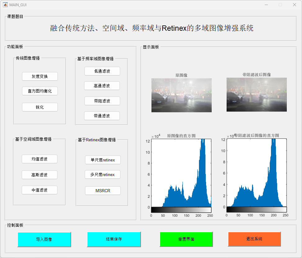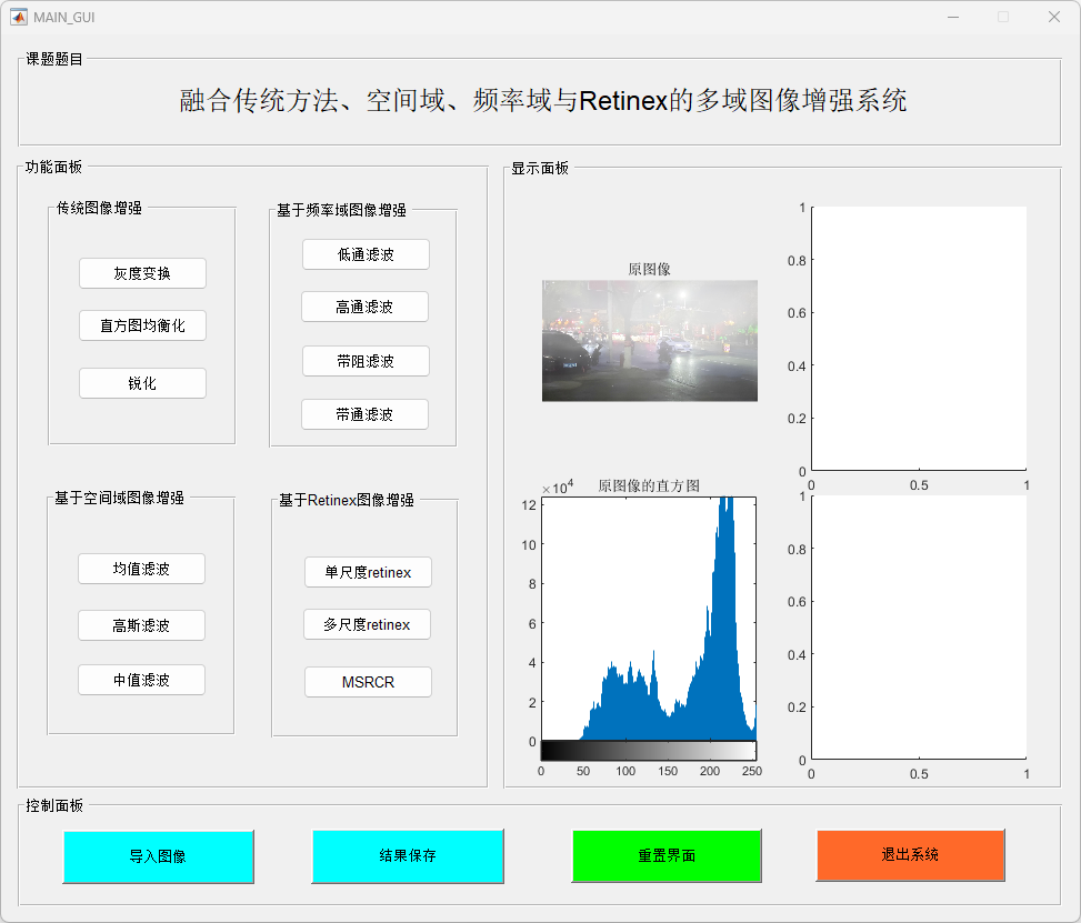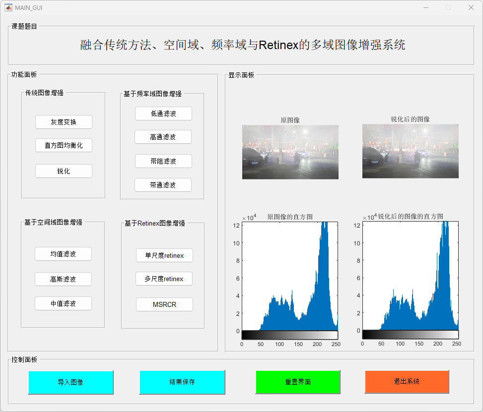 本研究提出并实现了一个基于MATLAB的多功能图像增强系统,结合了传统图像增强、空间域滤波、频率域处理和Retinex图像增强算法,以提高图像质量并增强图像细节。该系统通过一个用户友好的图形界面(GUI),提供了包括图像加载、增强处理、滤波操作及保存输出等多种功能。研究的主要贡献包括以下几个方面: