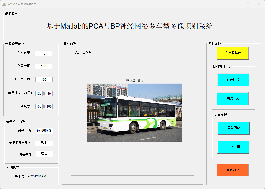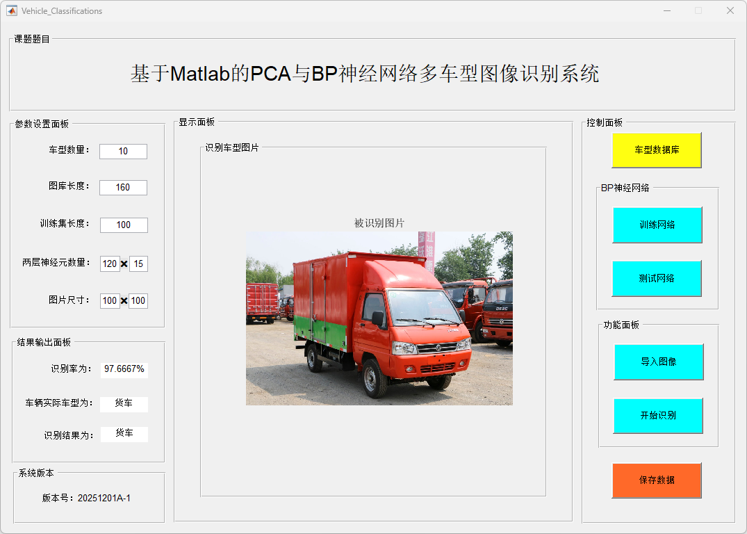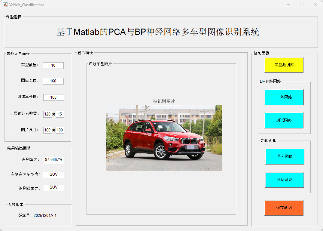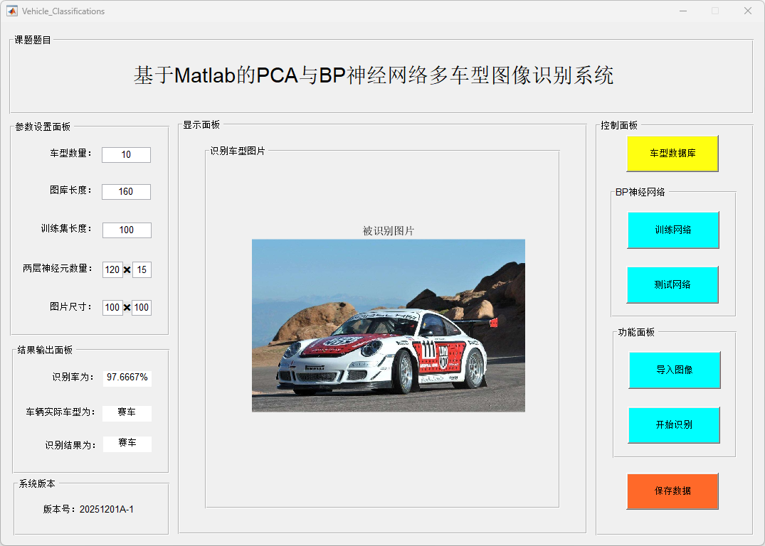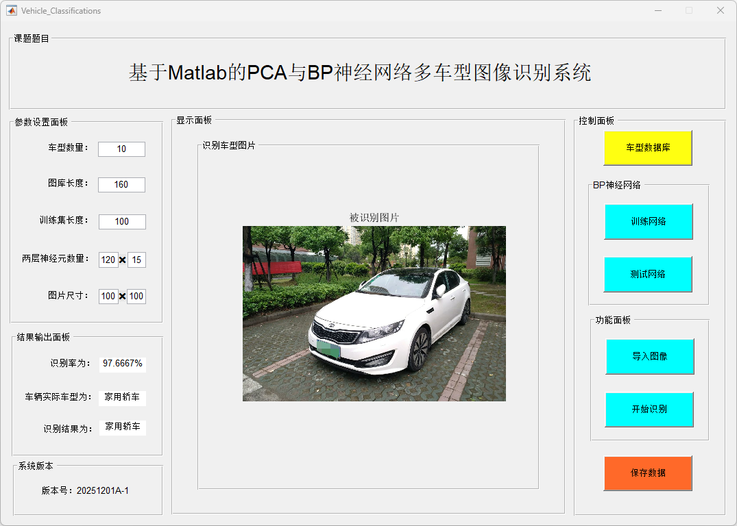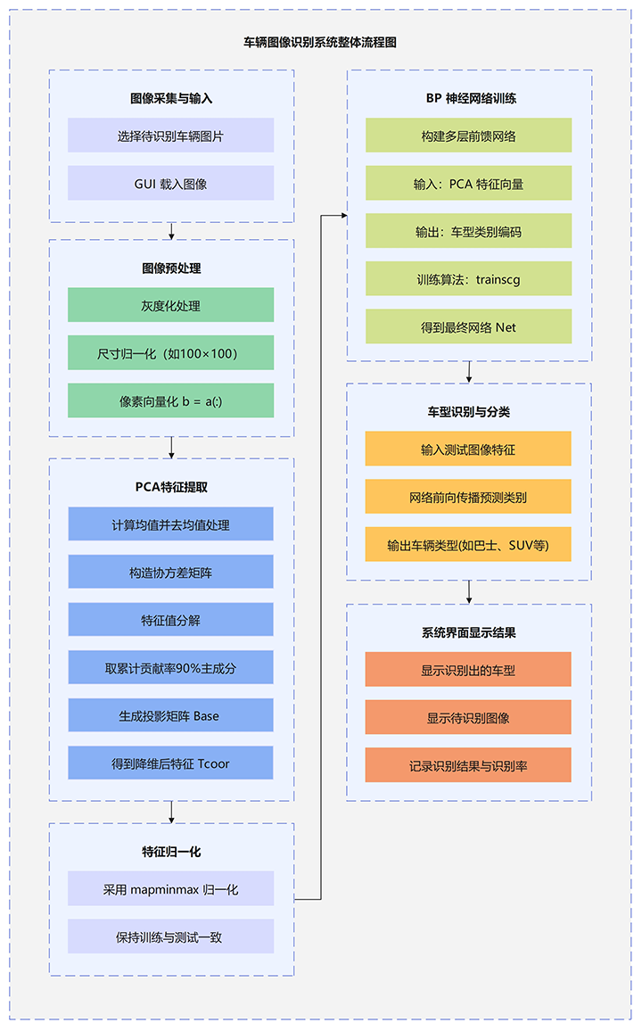 系统对采集到的车辆图像进行灰度化、归一化和像素向量化等预处理操作,以保证图像数据的一致性,并利用 PCA 方法对高维像素特征进行降维,提取能够有效区分不同车型的主特征向量,从而显著降低计算维度并提高特征表达能力。在此基础上构建 BP 神经网络分类器,对车辆图像进行训练与识别。本文还设计了可视化 MATLAB GUI 系统,实现了模型训练、图片测试、识别率评估以及识别结果展示等功能。