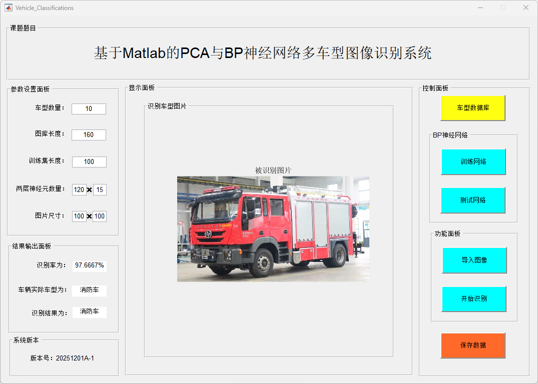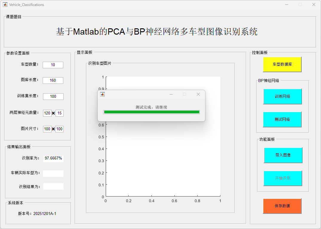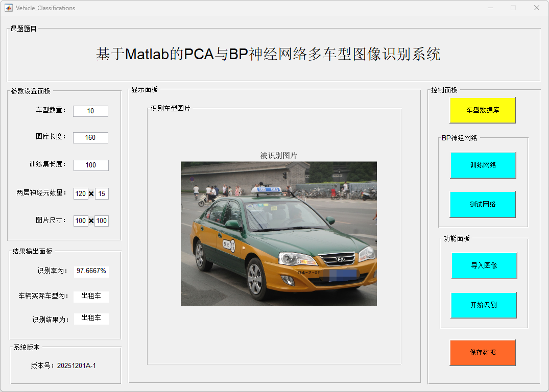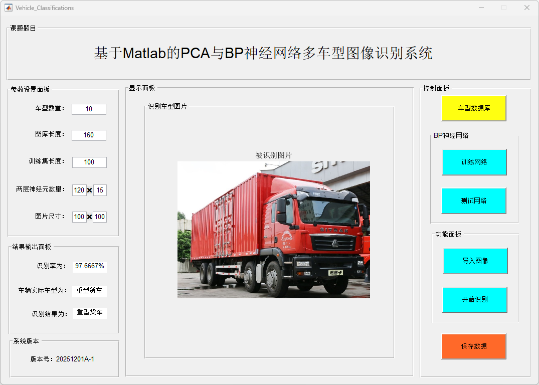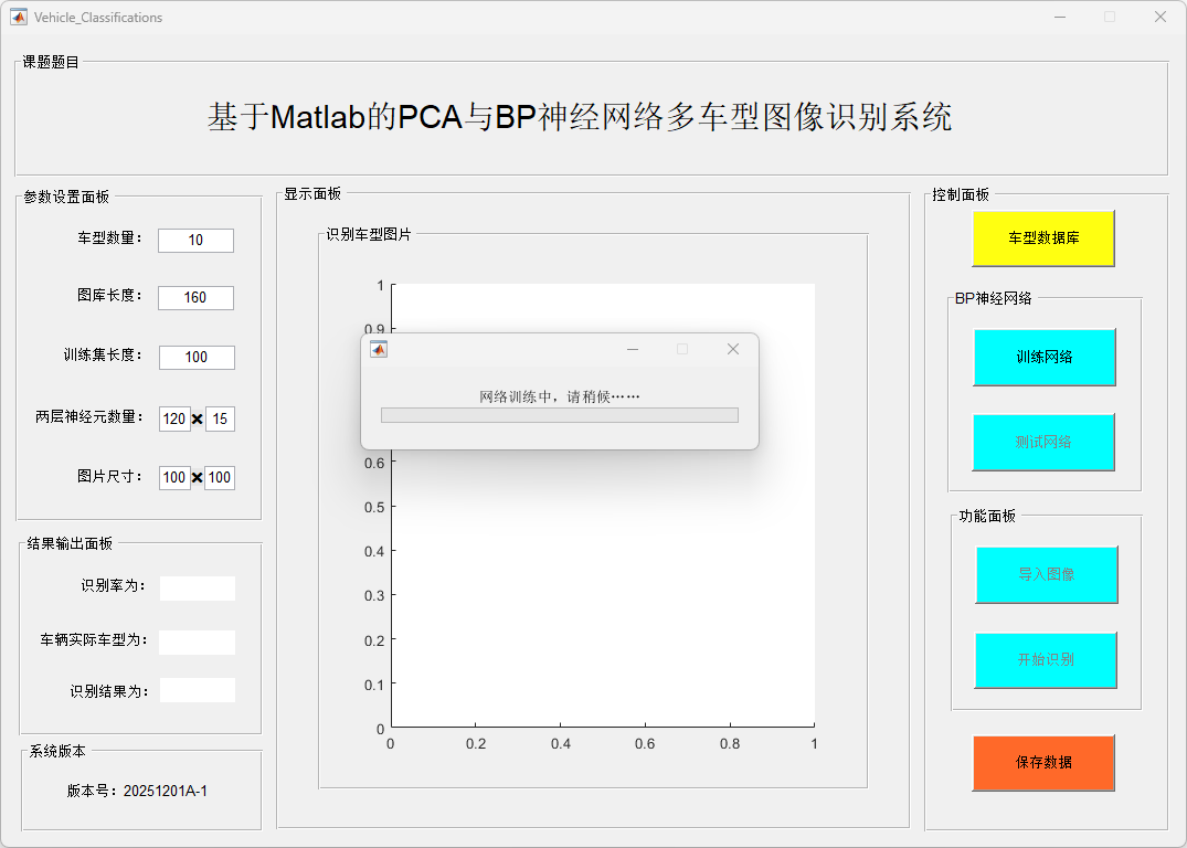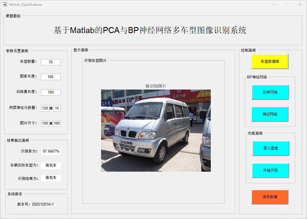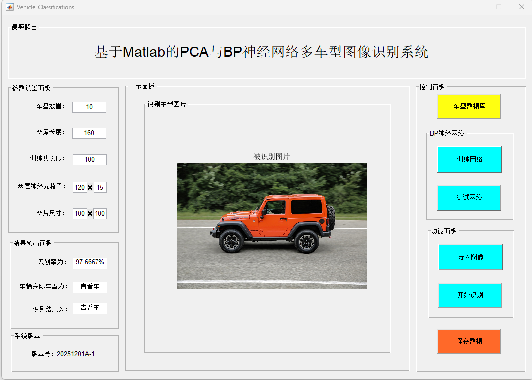 系统对采集到的车辆图像进行灰度化、归一化和像素向量化等预处理操作,以保证图像数据的一致性,并利用 PCA 方法对高维像素特征进行降维,提取能够有效区分不同车型的主特征向量,从而显著降低计算维度并提高特征表达能力。在此基础上构建 BP 神经网络分类器,对车辆图像进行训练与识别。本文还设计了可视化 MATLAB GUI 系统,实现了模型训练、图片测试、识别率评估以及识别结果展示等功能。