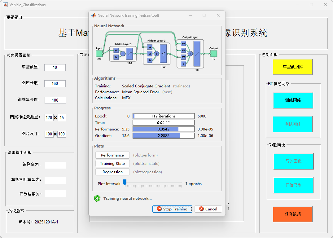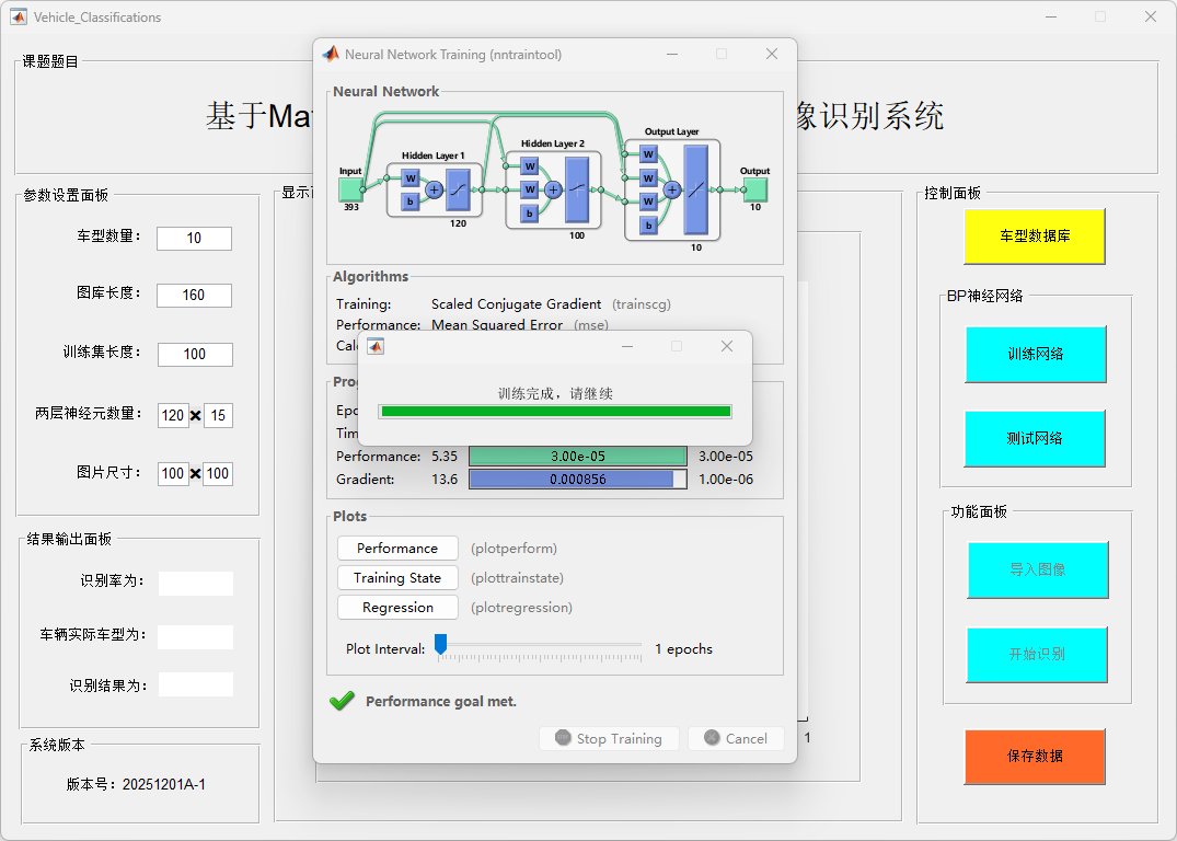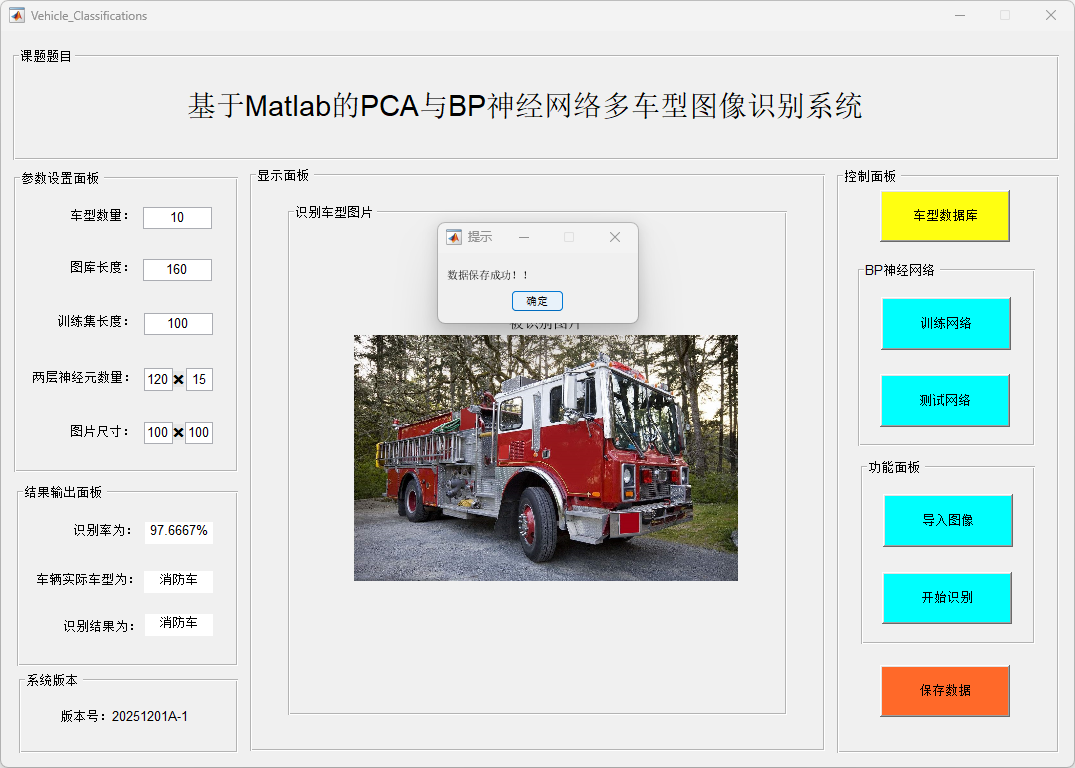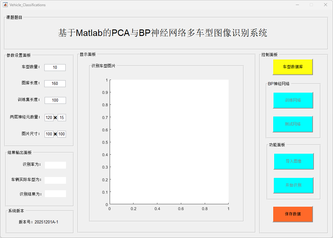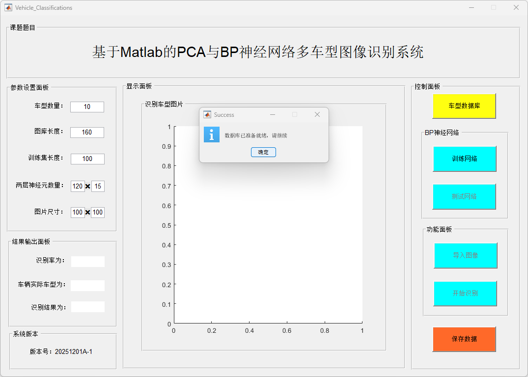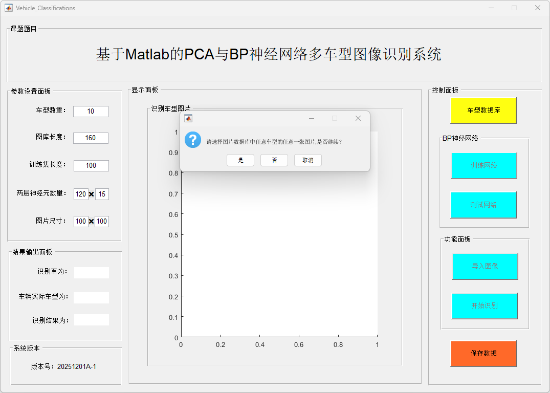 系统对采集到的车辆图像进行灰度化、归一化和像素向量化等预处理操作,以保证图像数据的一致性,并利用 PCA 方法对高维像素特征进行降维,提取能够有效区分不同车型的主特征向量,从而显著降低计算维度并提高特征表达能力。在此基础上构建 BP 神经网络分类器,对车辆图像进行训练与识别。本文还设计了可视化 MATLAB GUI 系统,实现了模型训练、图片测试、识别率评估以及识别结果展示等功能。