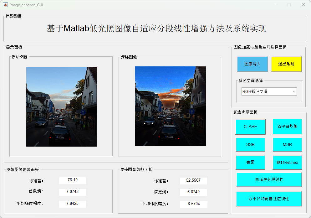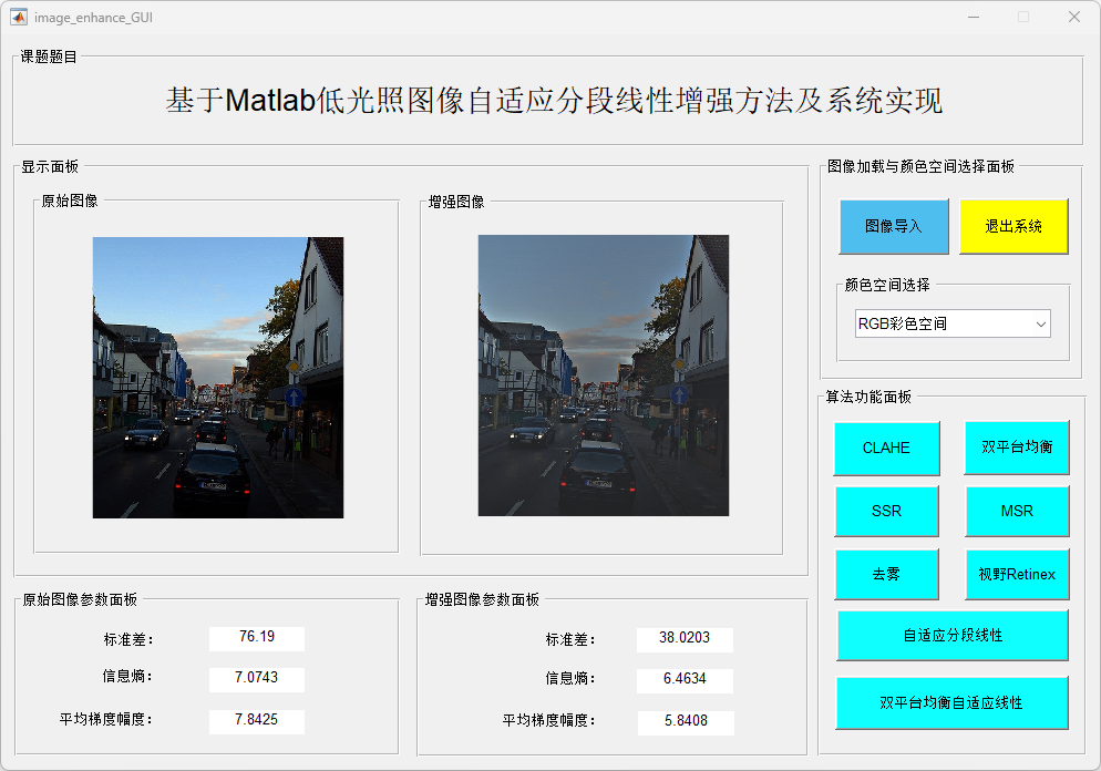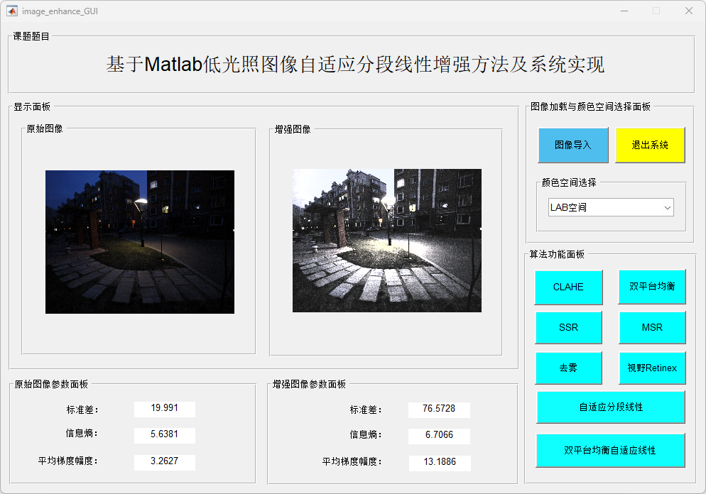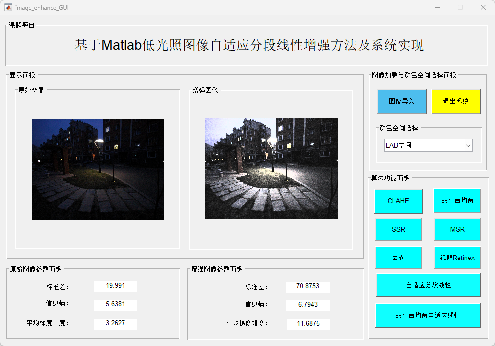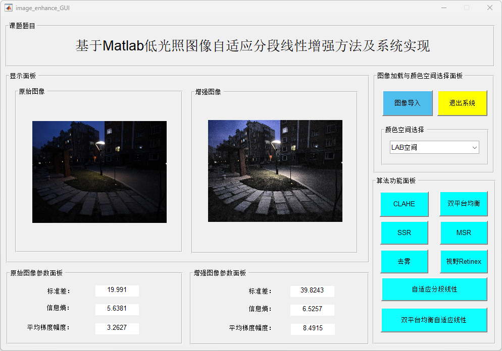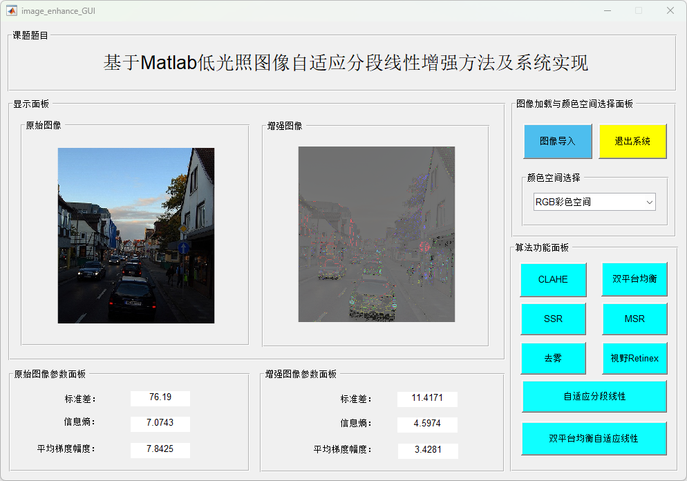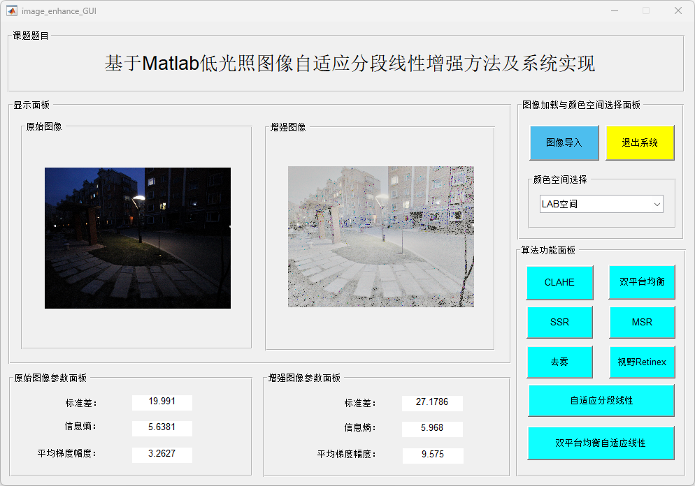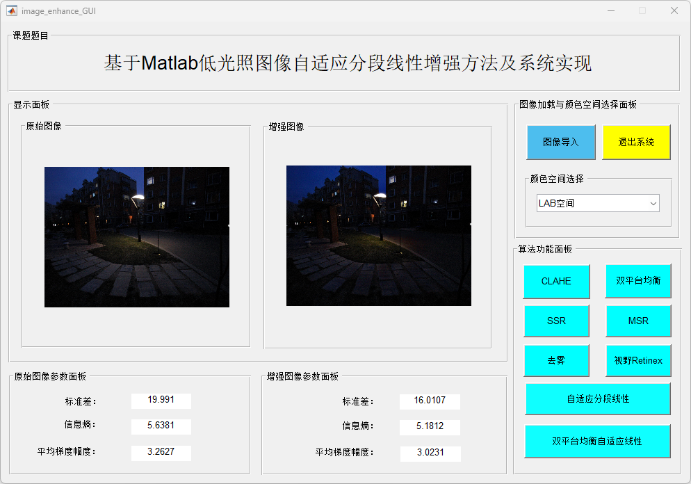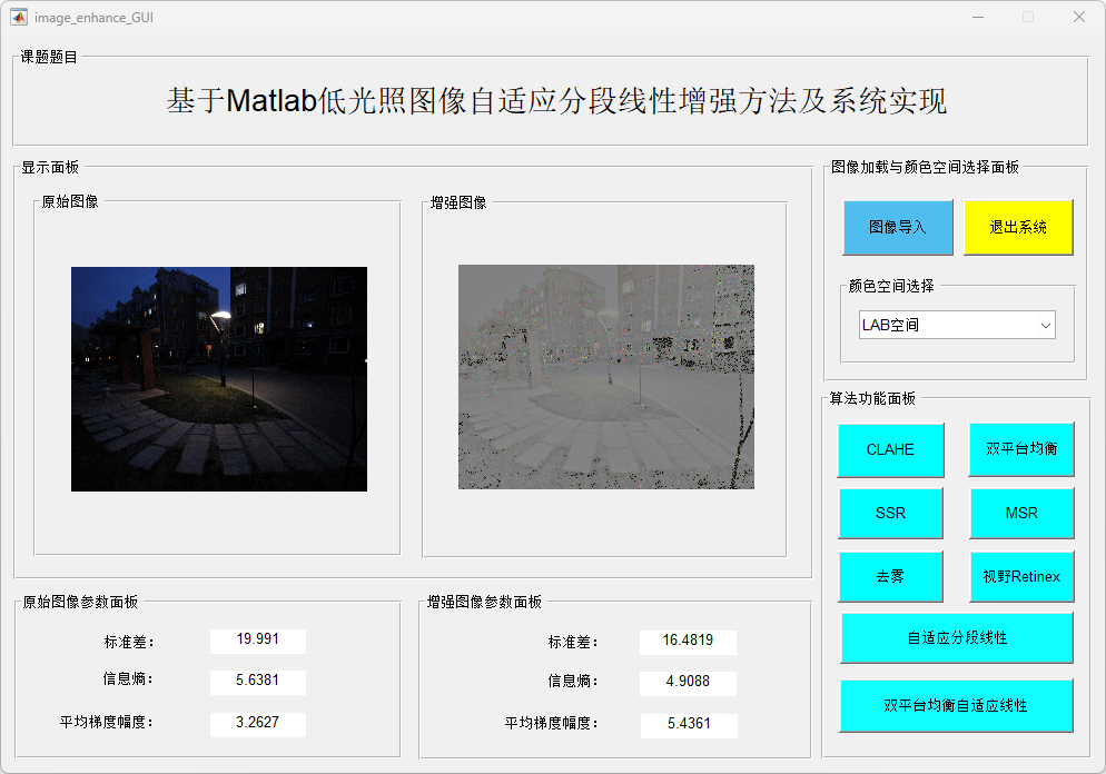 在系统实现方面,本文基于 Matlab GUIDE 构建图形化用户界面,实现图像导入、颜色空间转换(RGB、HSV、HSI、YCbCr、Lab)、增强算法选择、可视化展示及参数对比等功能,形成一个完整、可视化、可扩展的低光照图像增强平台。系统同时集成标准差、信息熵和平均梯度等评价指标,用于从亮度分布、信息量以及边缘清晰度等角度对增强结果进行量化分析。