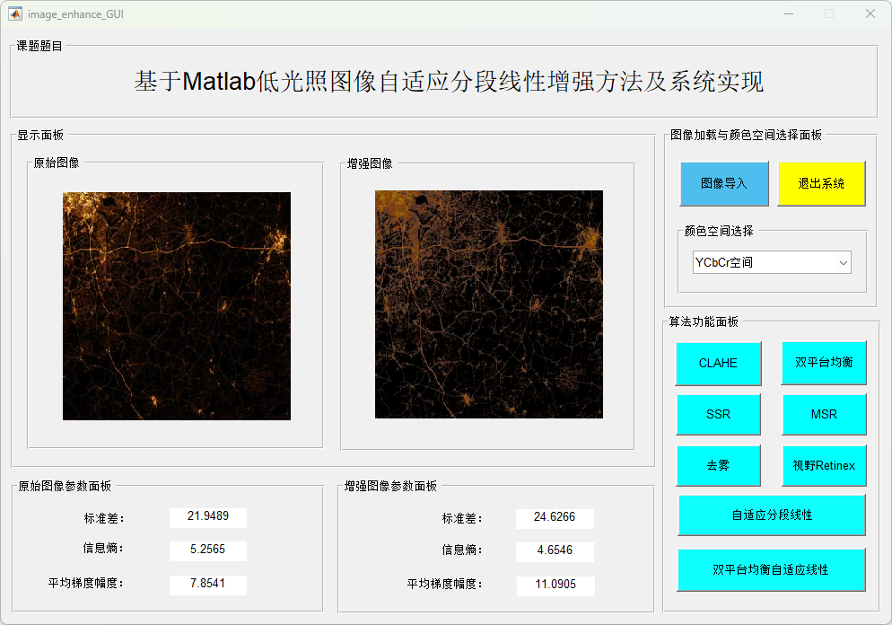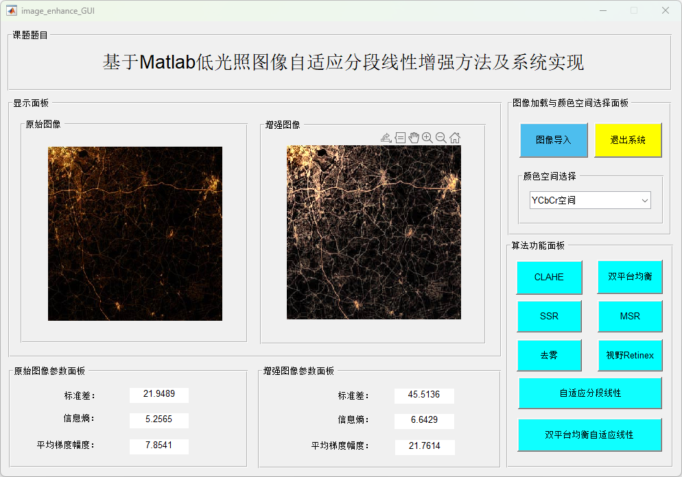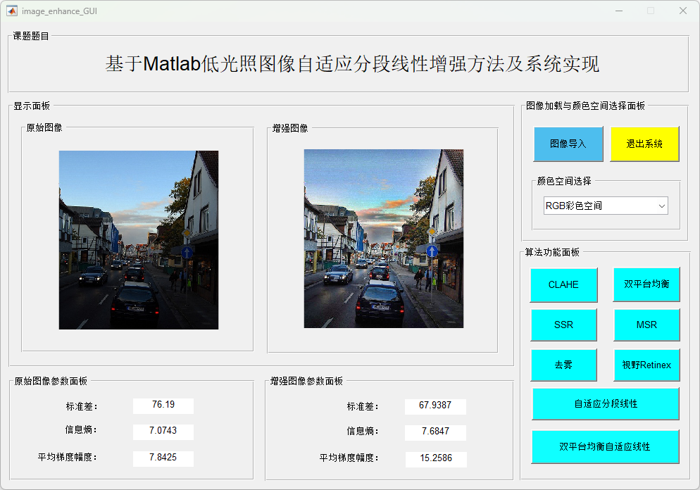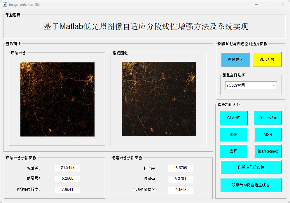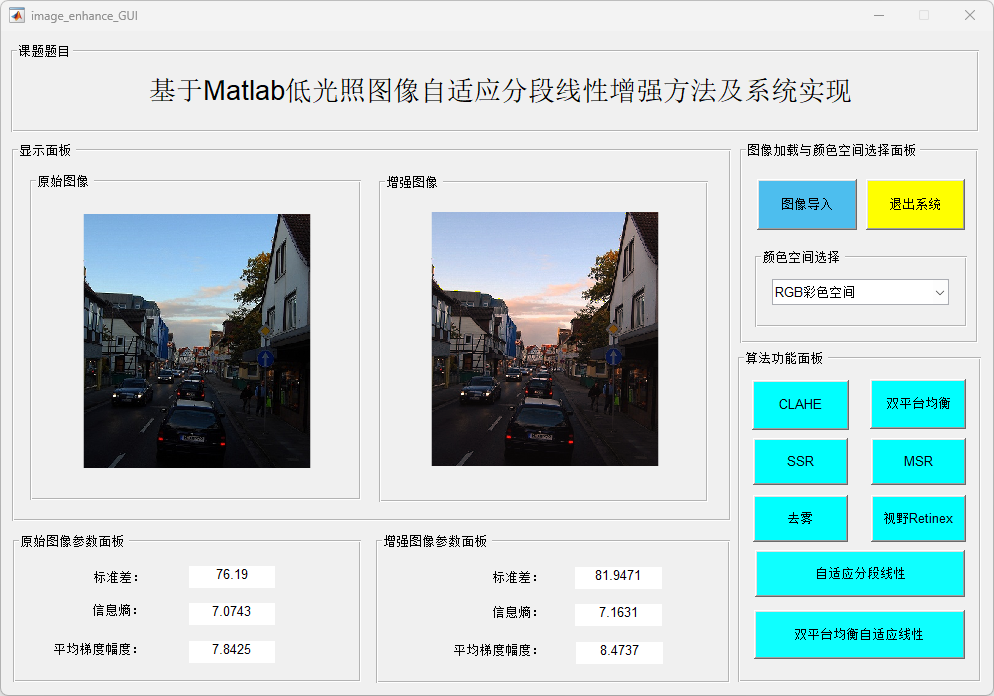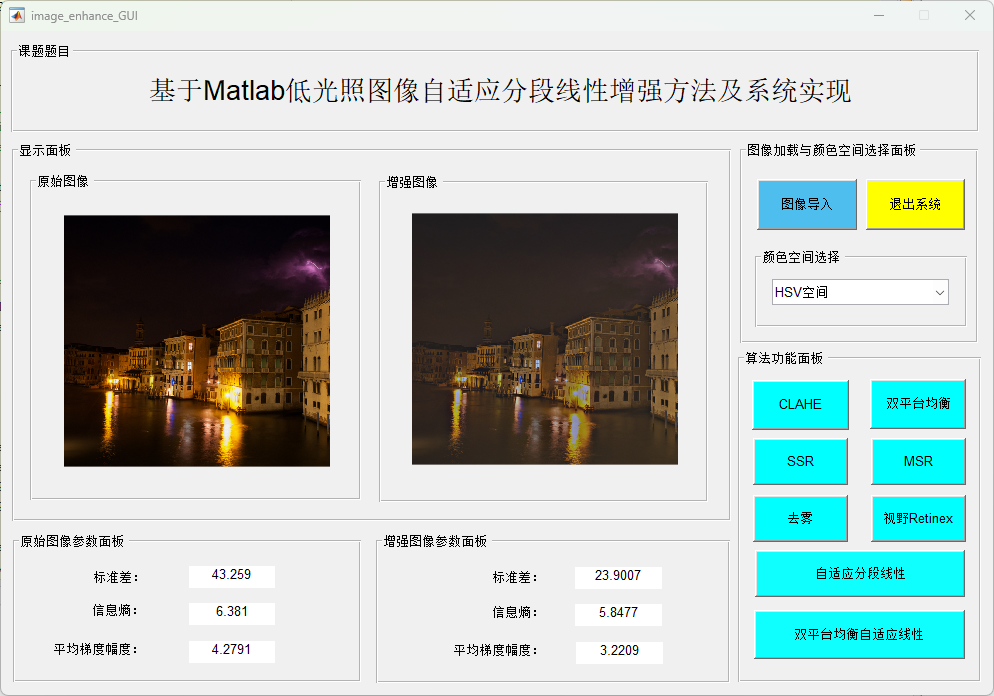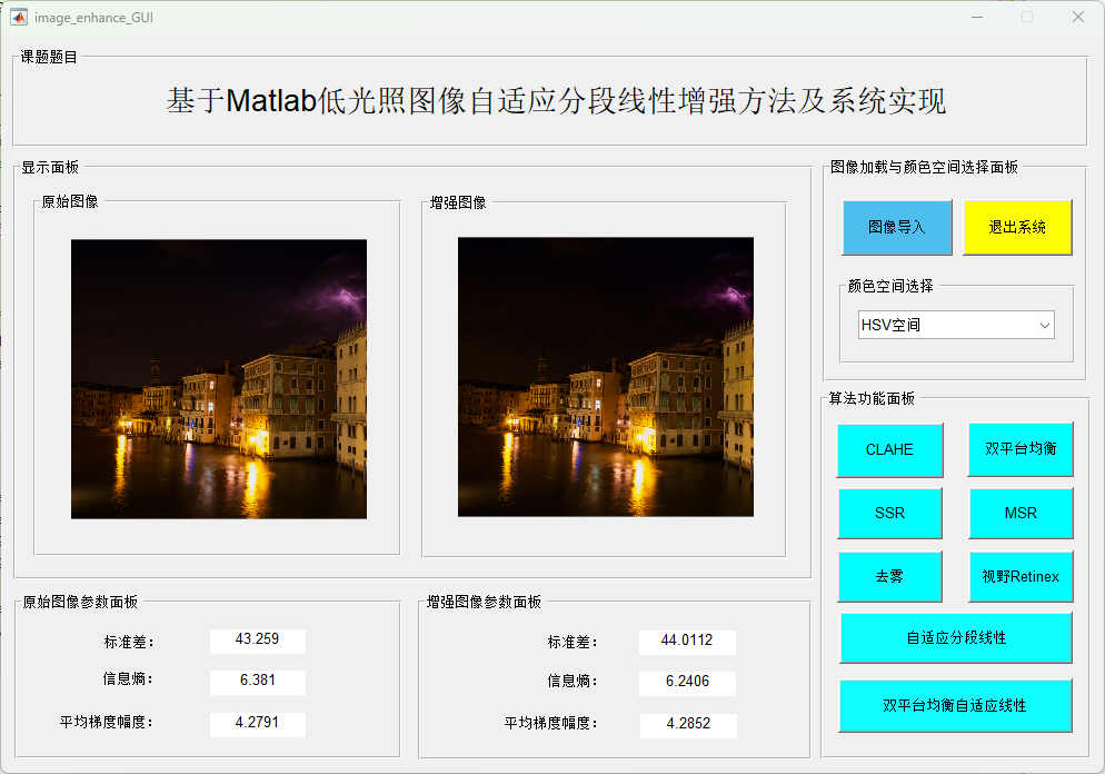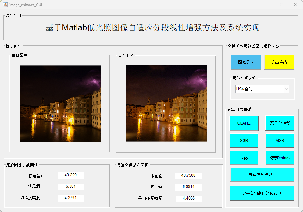 在系统实现方面,本文基于 Matlab GUIDE 构建图形化用户界面,实现图像导入、颜色空间转换(RGB、HSV、HSI、YCbCr、Lab)、增强算法选择、可视化展示及参数对比等功能,形成一个完整、可视化、可扩展的低光照图像增强平台。系统同时集成标准差、信息熵和平均梯度等评价指标,用于从亮度分布、信息量以及边缘清晰度等角度对增强结果进行量化分析。