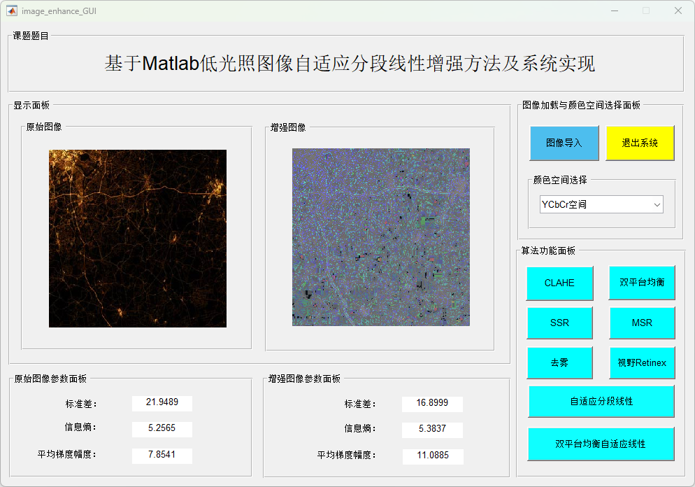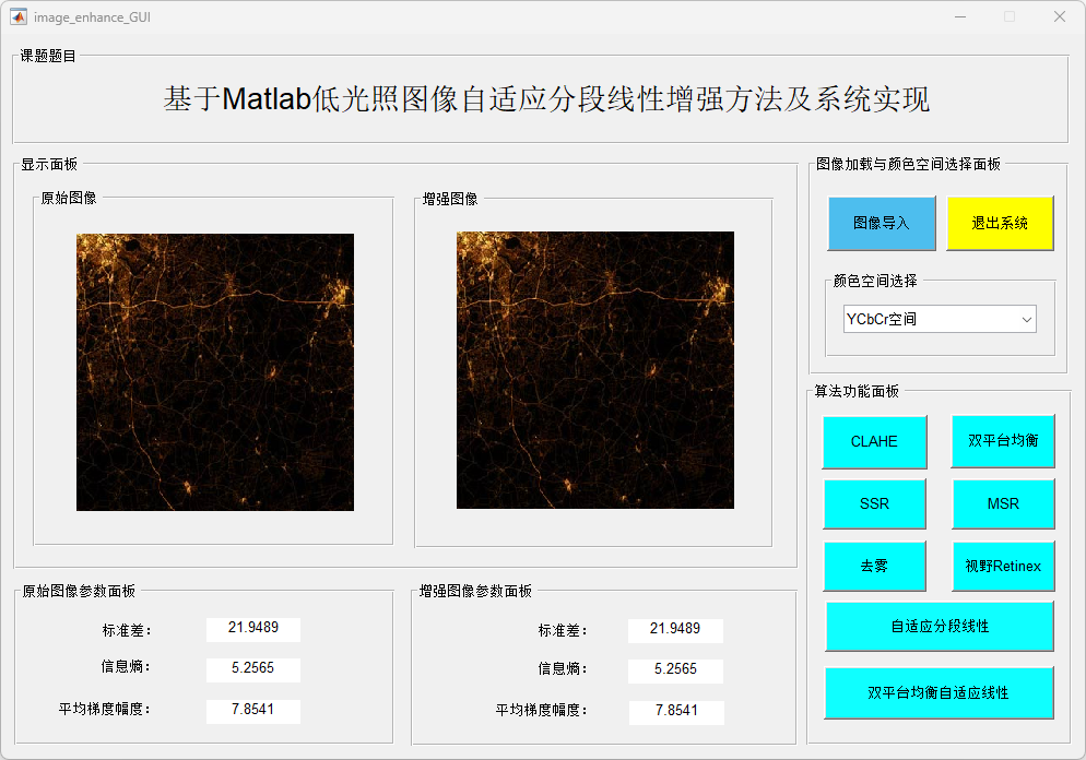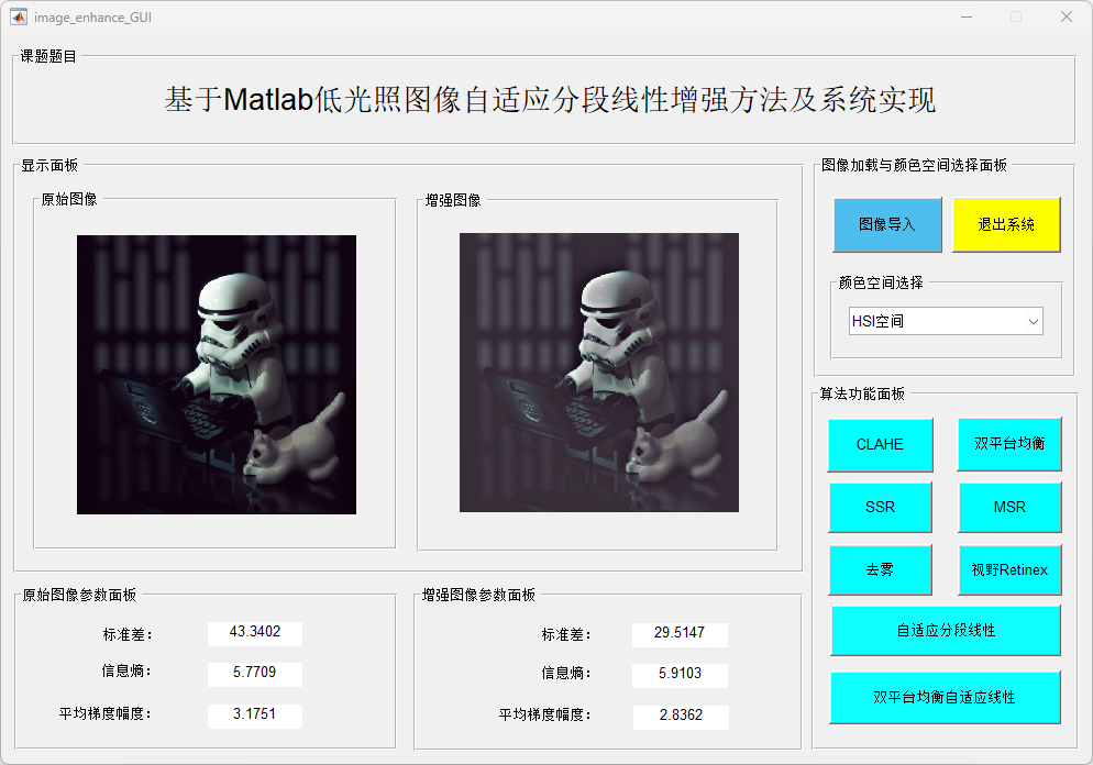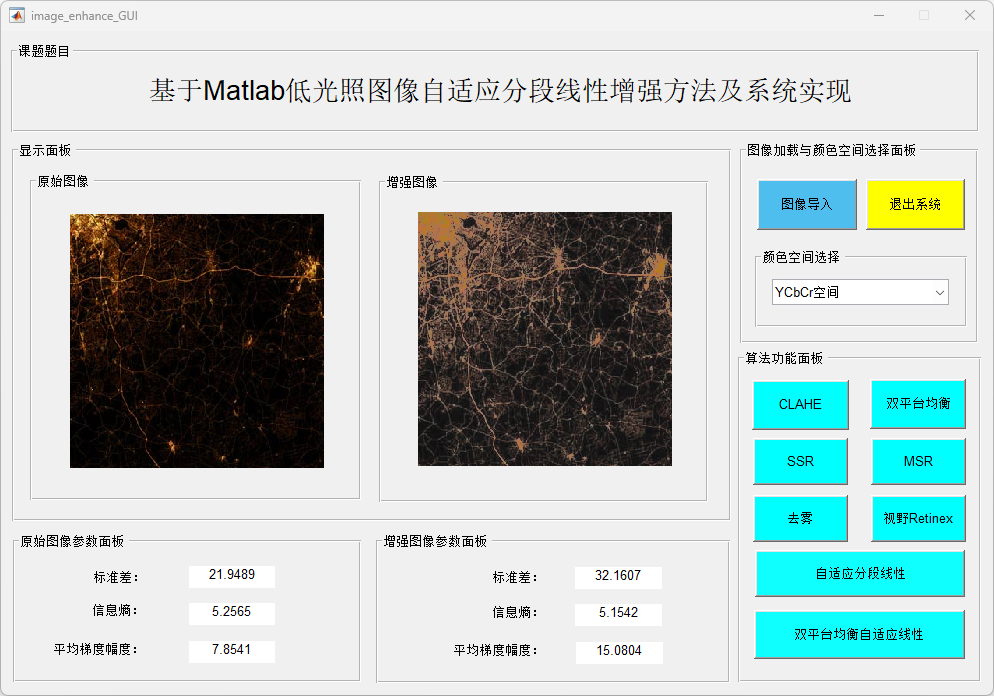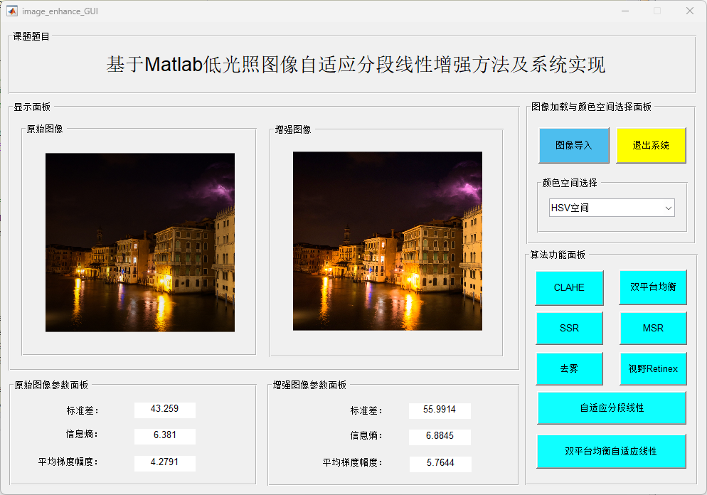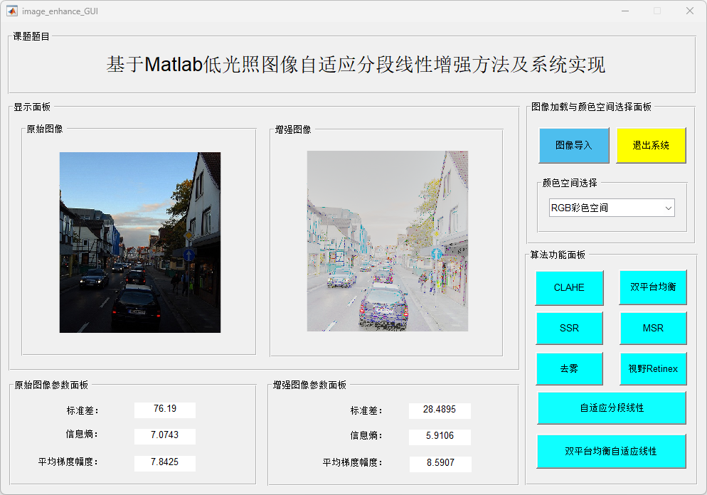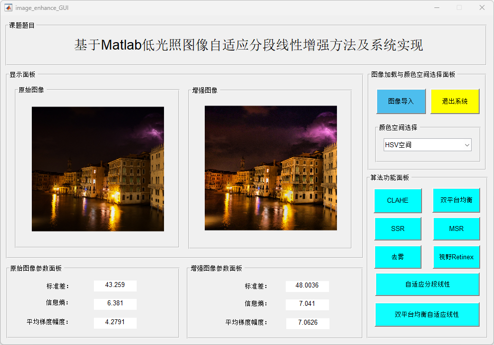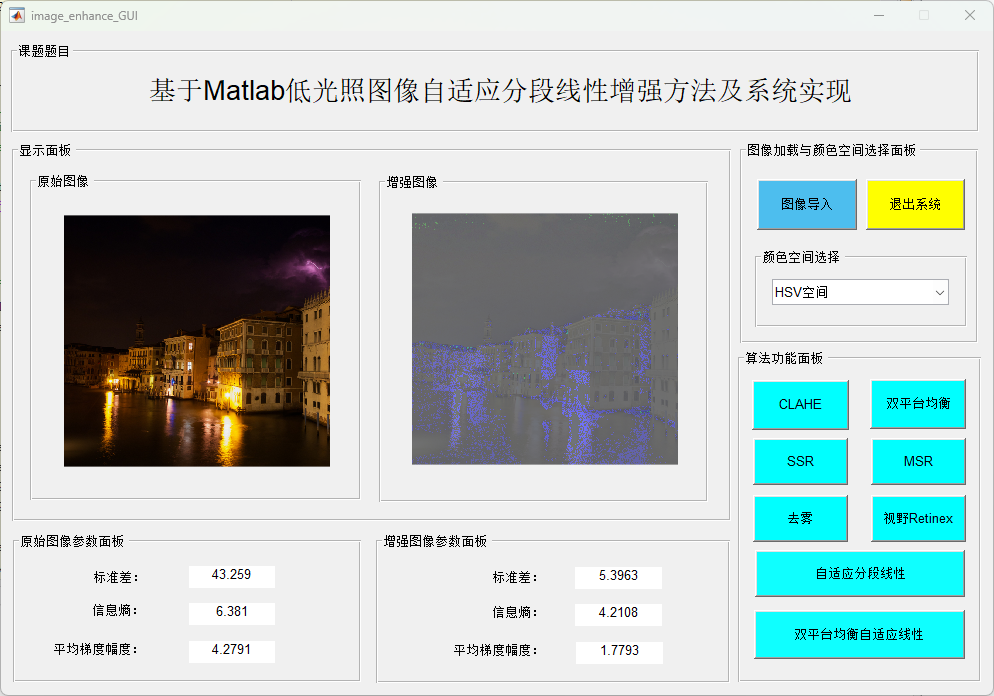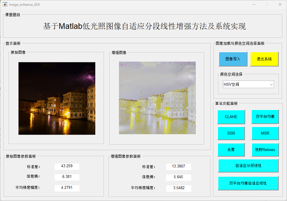 在系统实现方面,本文基于 Matlab GUIDE 构建图形化用户界面,实现图像导入、颜色空间转换(RGB、HSV、HSI、YCbCr、Lab)、增强算法选择、可视化展示及参数对比等功能,形成一个完整、可视化、可扩展的低光照图像增强平台。系统同时集成标准差、信息熵和平均梯度等评价指标,用于从亮度分布、信息量以及边缘清晰度等角度对增强结果进行量化分析。