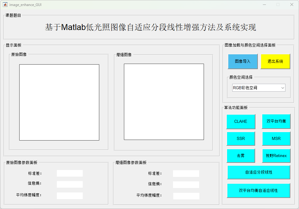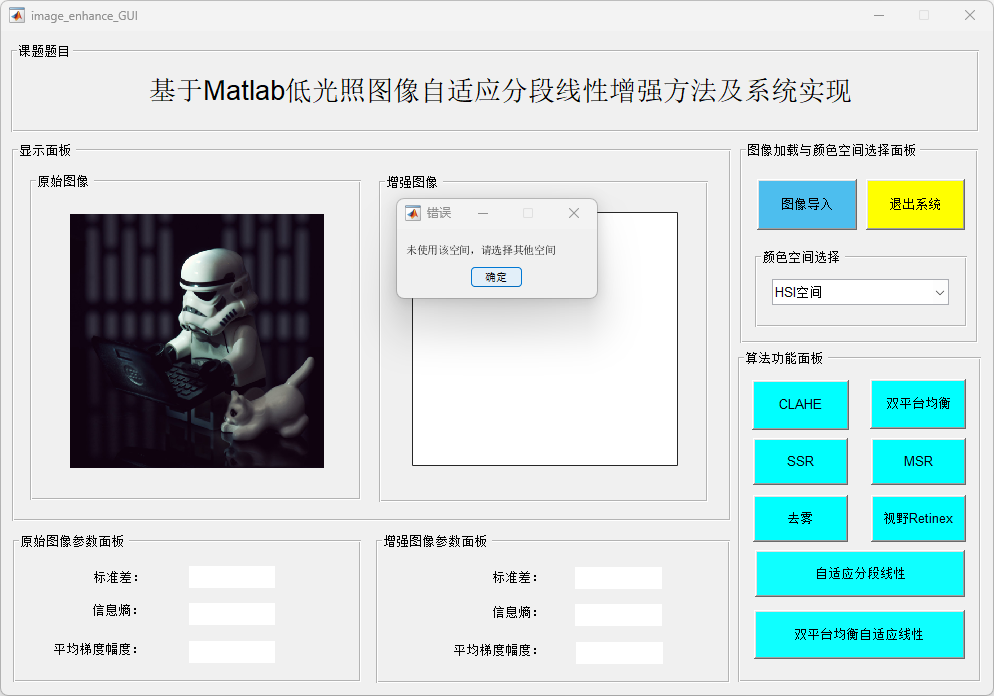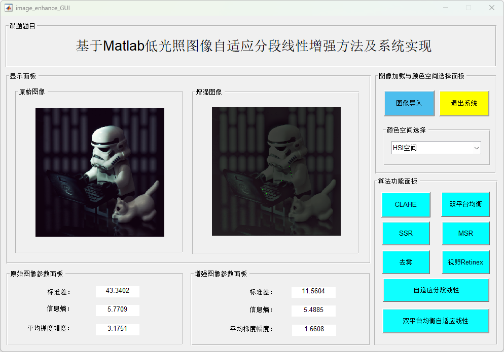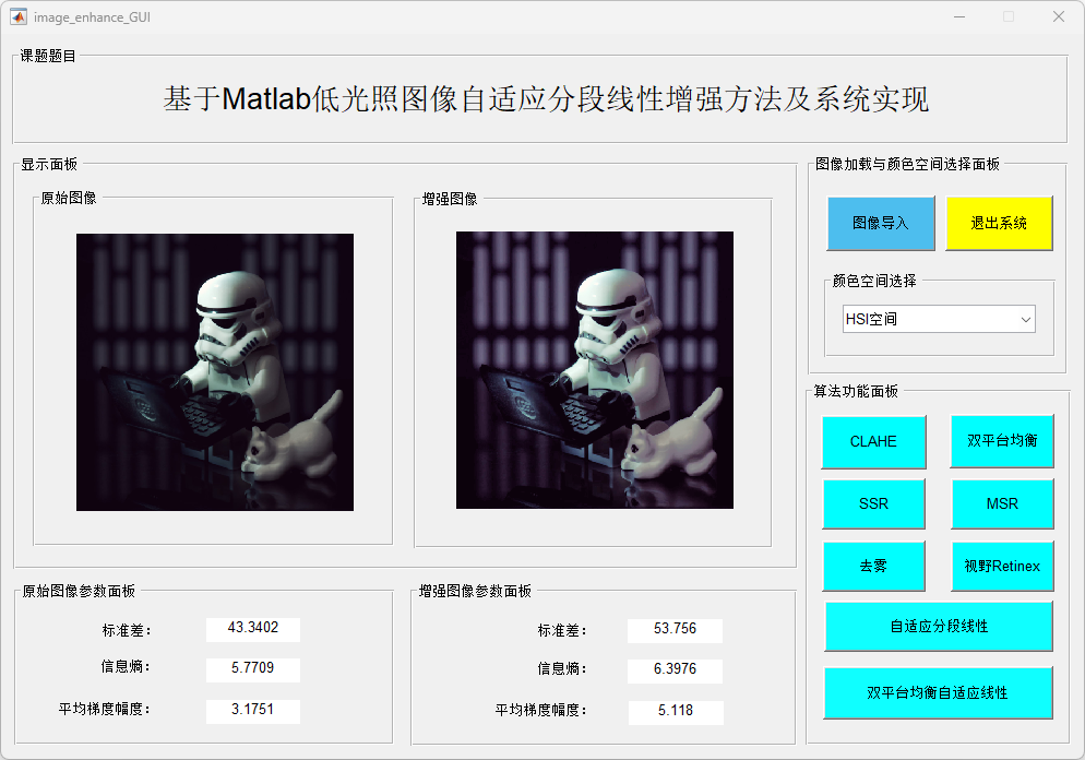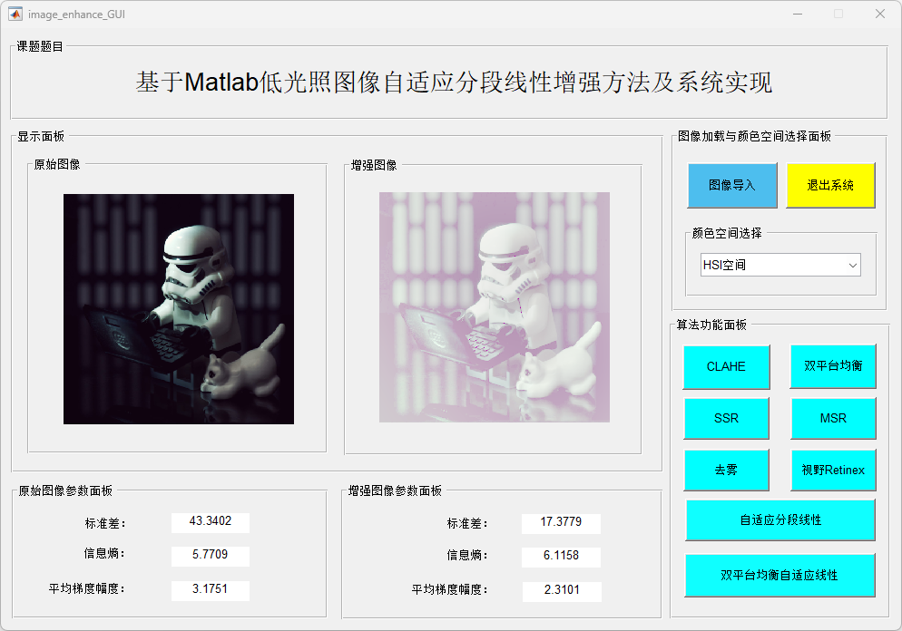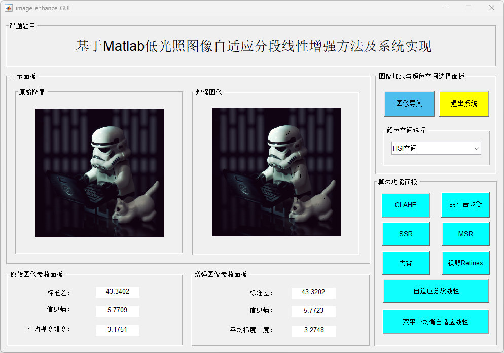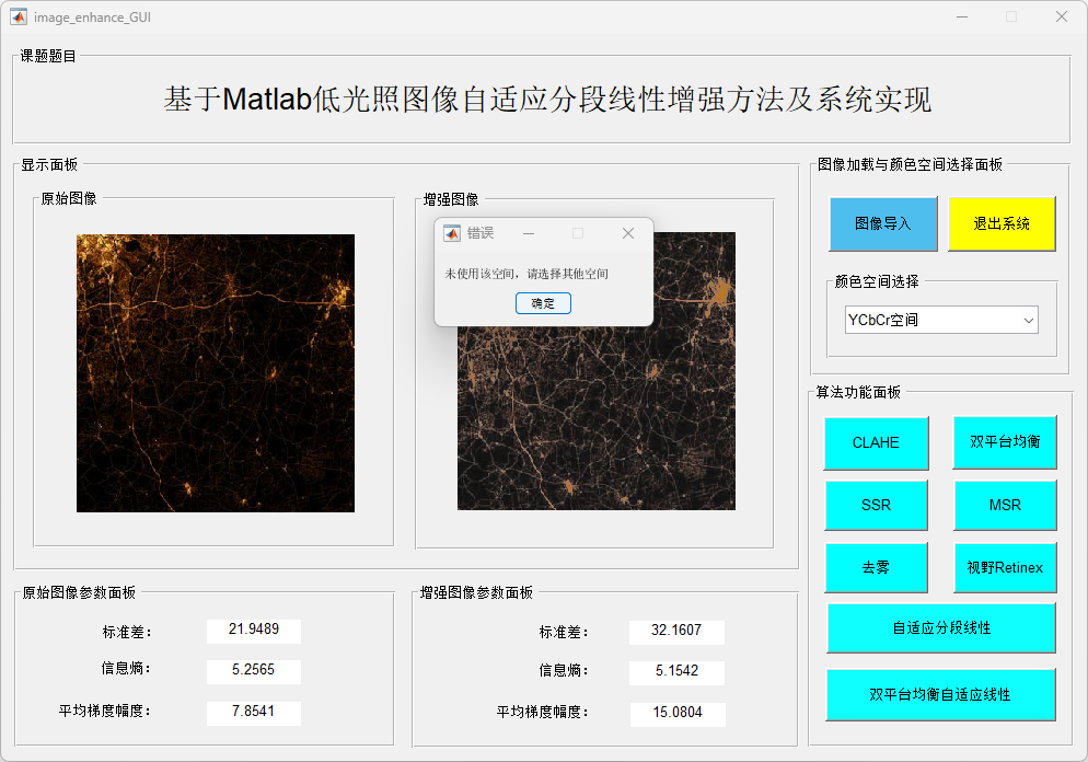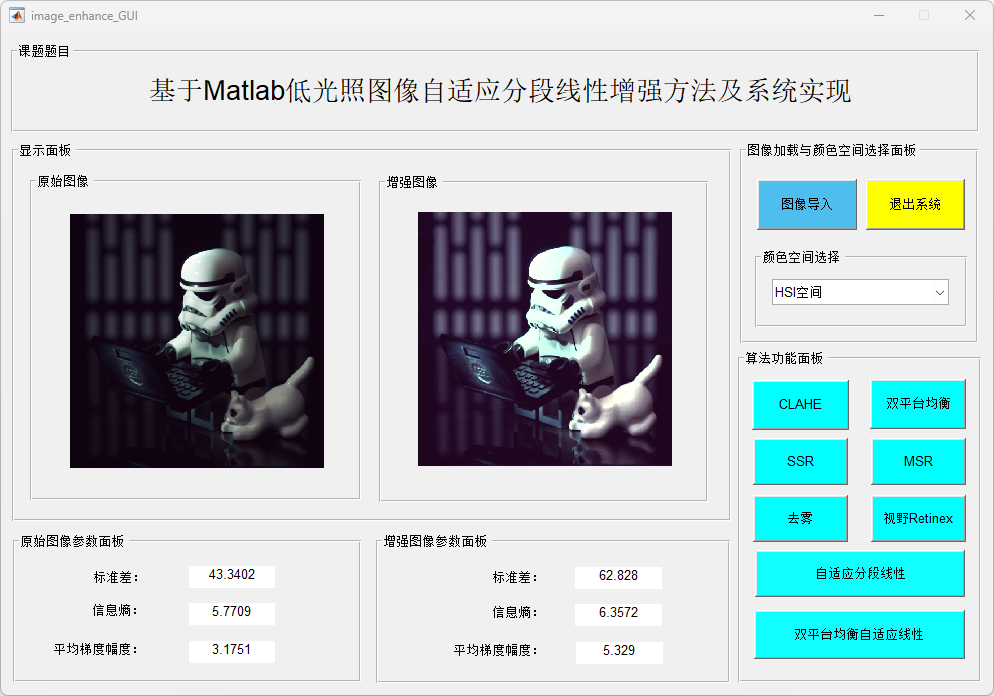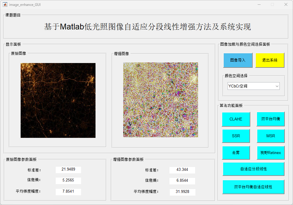 在系统实现方面,本文基于 Matlab GUIDE 构建图形化用户界面,实现图像导入、颜色空间转换(RGB、HSV、HSI、YCbCr、Lab)、增强算法选择、可视化展示及参数对比等功能,形成一个完整、可视化、可扩展的低光照图像增强平台。系统同时集成标准差、信息熵和平均梯度等评价指标,用于从亮度分布、信息量以及边缘清晰度等角度对增强结果进行量化分析。