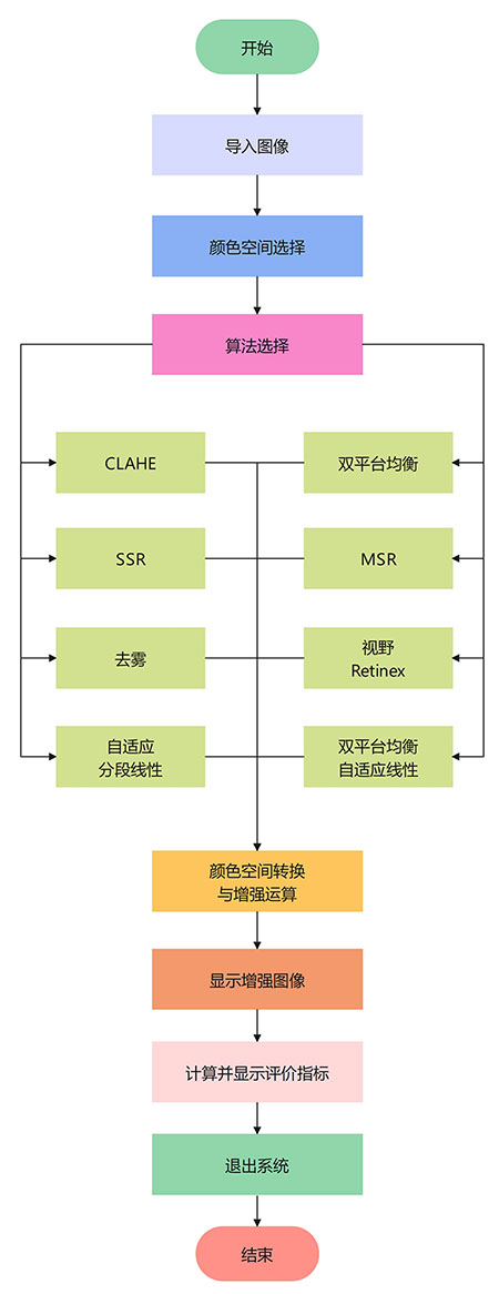 本系统基于 Matlab GUI 构建,采用模块化结构实现图像加载、颜色空间转换、增强算法处理与结果评价等功能,形成一个可视化、可扩展的低光照图像增强平台。