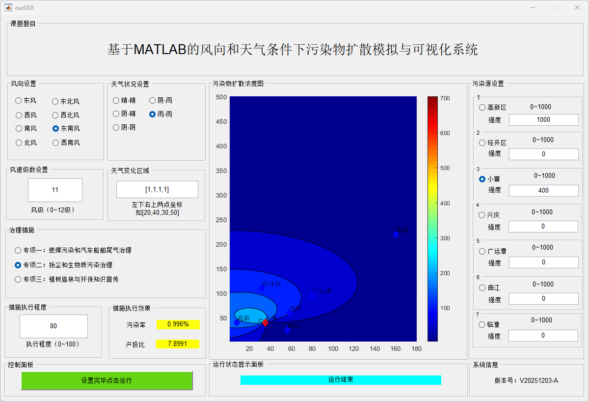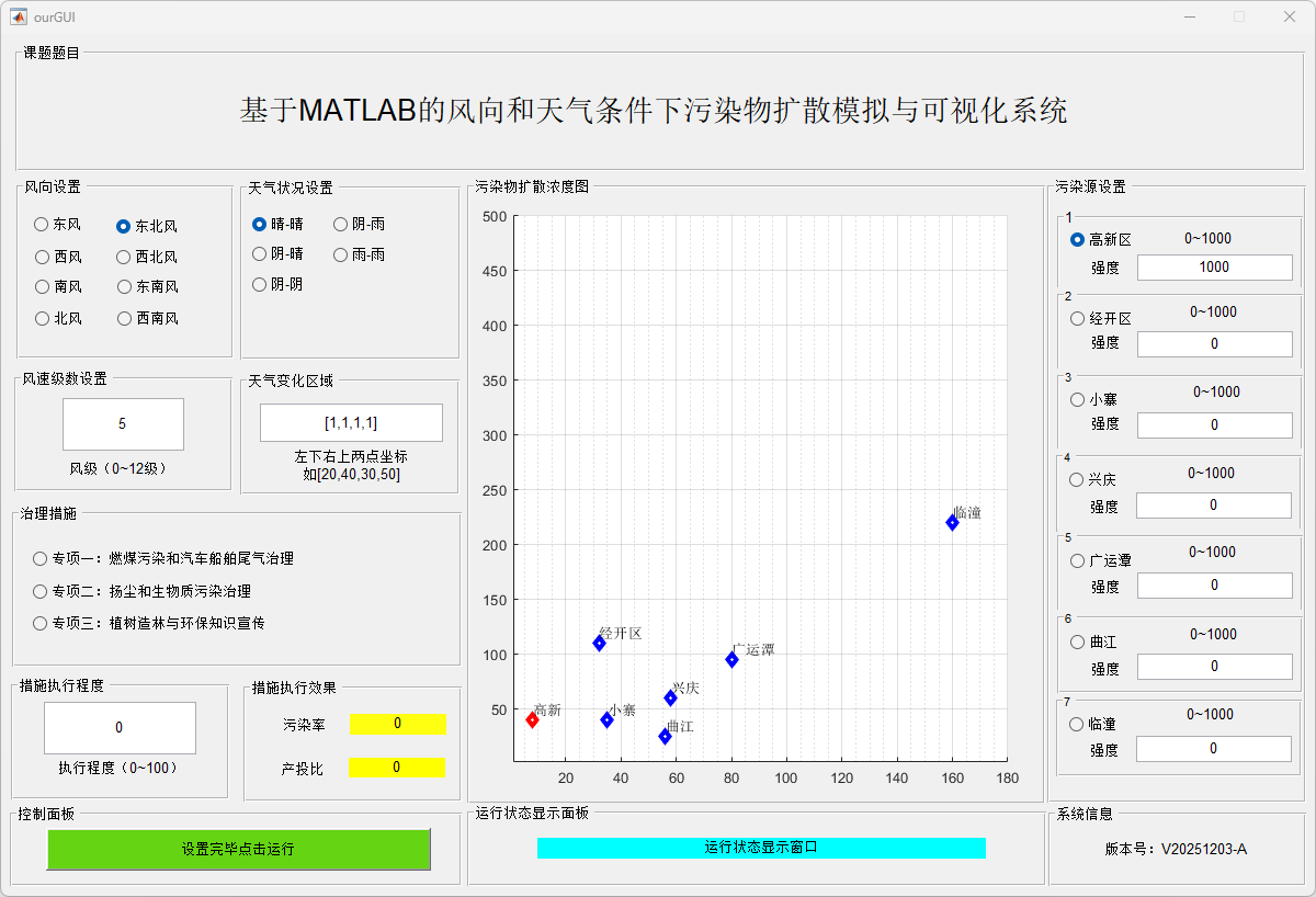 系统主界面展示了风向、风速、天气、污染源及治理措施等全部可调参数,为污染物扩散模拟提供完整交互入口。
